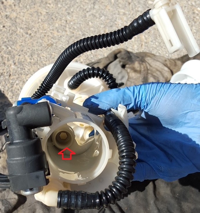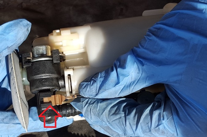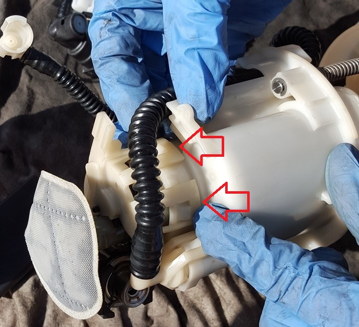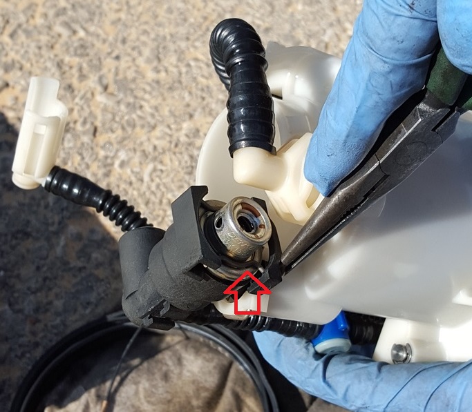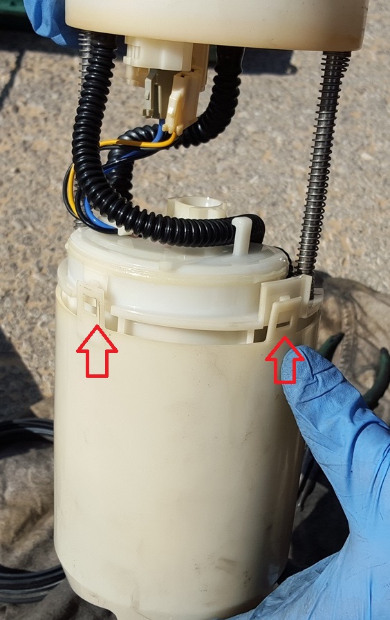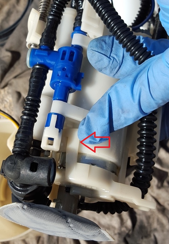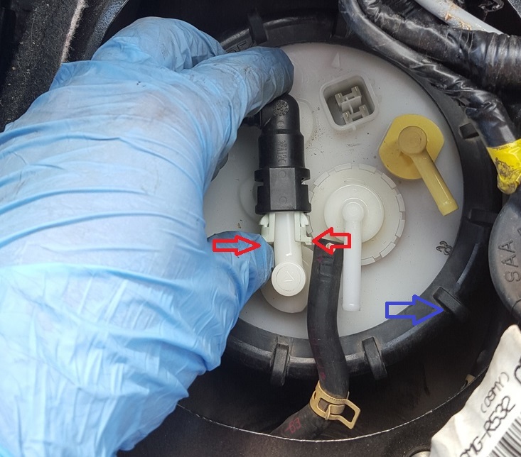 מנתקים את צינור אספקת הדלק על ידי לחיצה משתי הצדדים על השפתיים של הנעילה (חצים אדומים) ומשיכת הצינור. כעת נותר לפתוח את אום הפלסטיק האוחז את המשאבה. לאום בליטות פלסטיק שניתן להאחז בהן (חץ כחול)