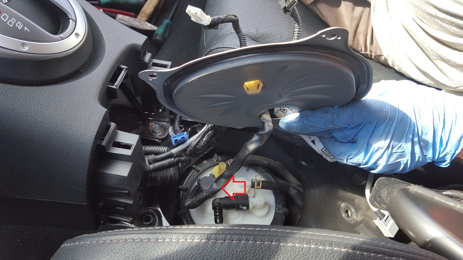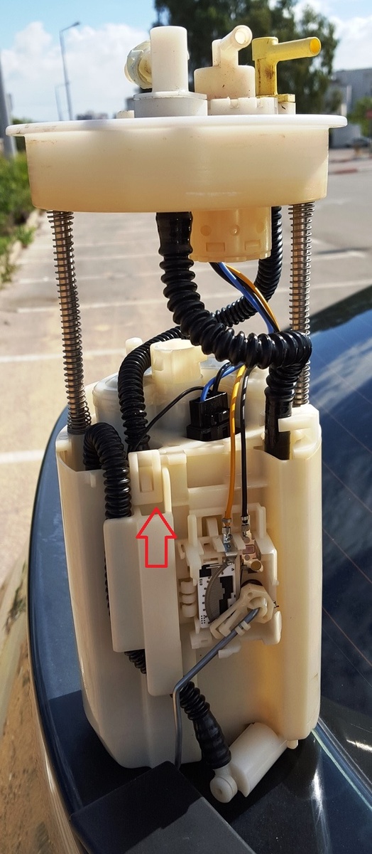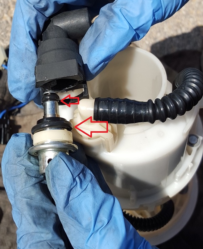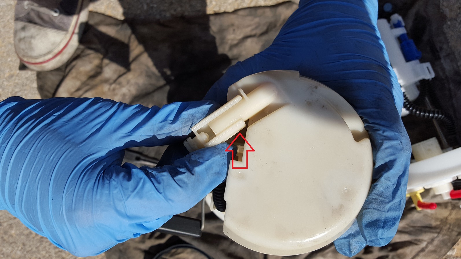 מנתקים את צינור אספקת הדלק על ידי לחיצה משתי הצדדים על השפתיים של הנעילה (חצים אדומים) ומשיכת הצינור. כעת נותר לפתוח את אום הפלסטיק האוחז את המשאבה. לאום בליטות פלסטיק שניתן להאחז בהן (חץ כחול)