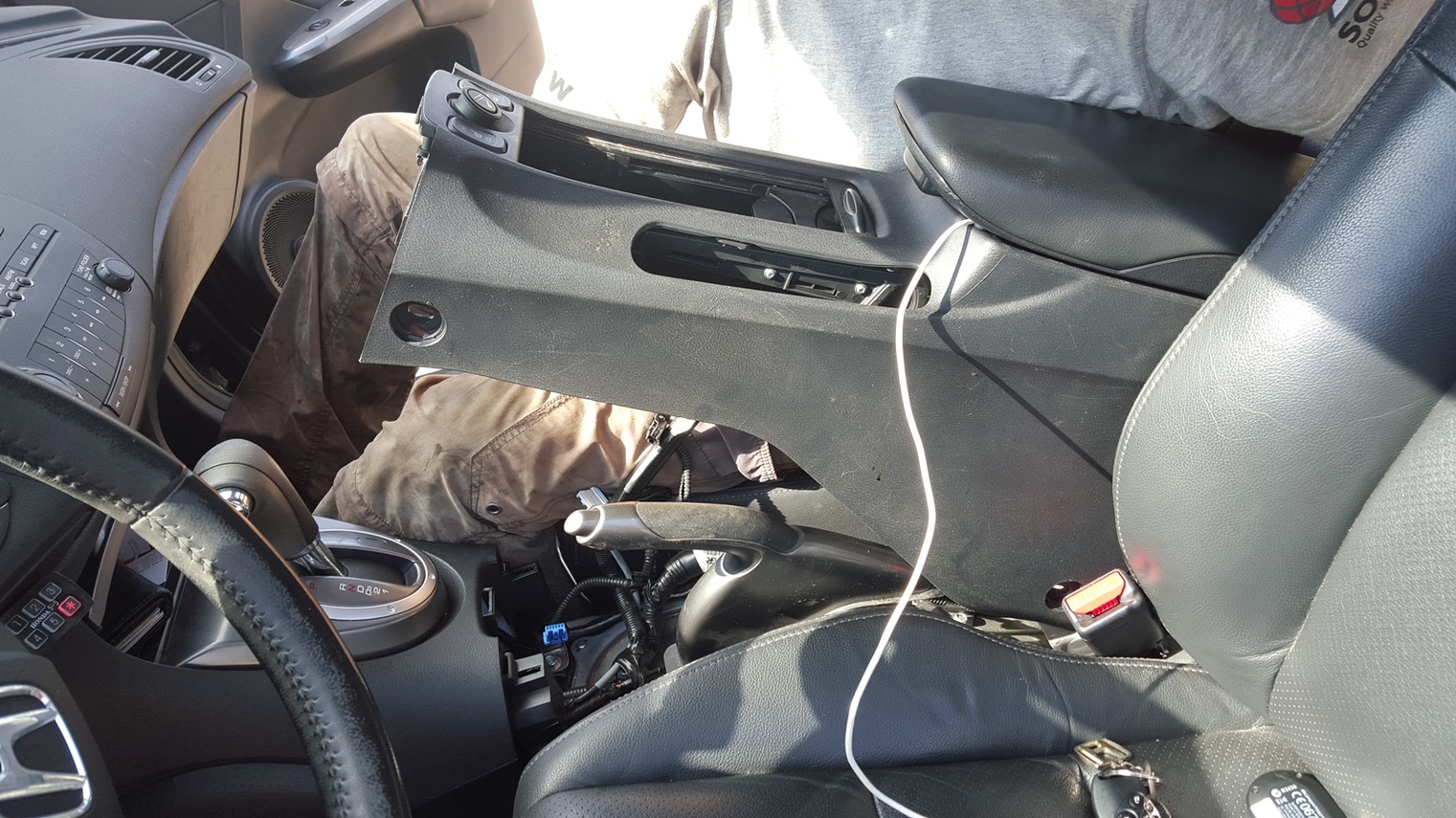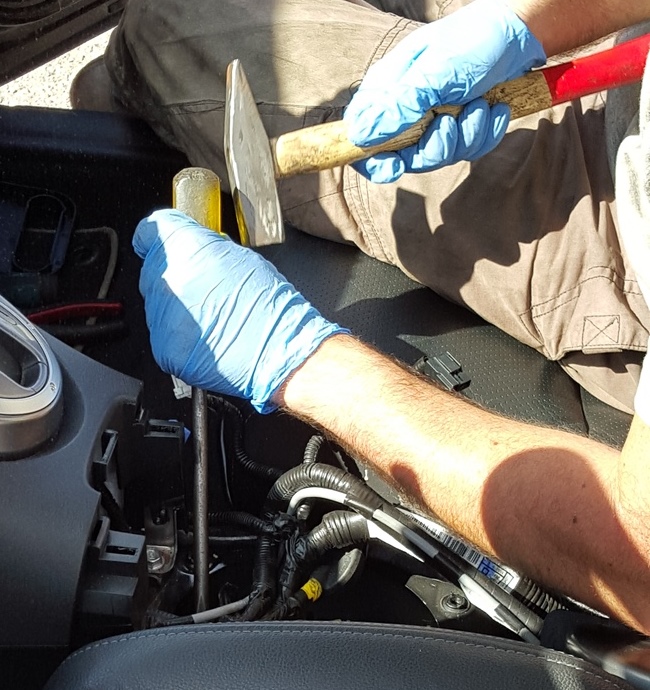 מזיזים את המושבים הקידמיים עד הסוף אחורה, עם מברג שטוח את פקקי הפלסטיק שסוגרים את הברגים בחלק הקידמי של הקונסולה, עם מברג פיליפס פותחים את הברגים.