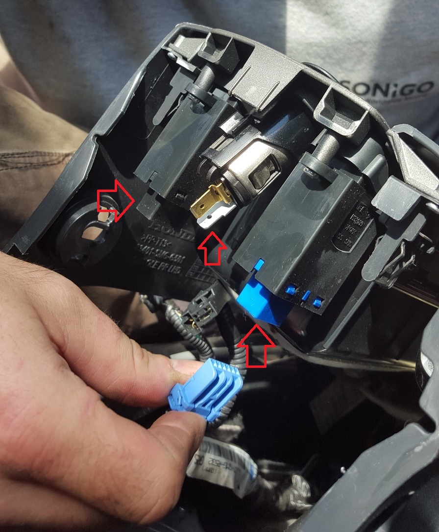 משחררים ממקומו מגע חשמלי (לדעתי מינוס) מתחתית המכלול, לוחצים על הלשונית שלו ומושכים החוצה.