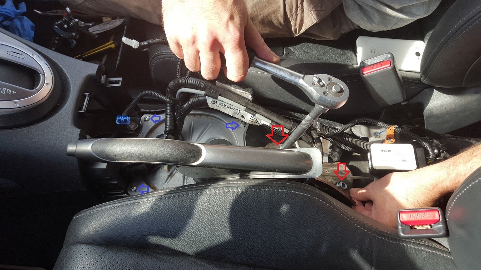 מורידים בלם יד (לא לפני שמודאים שהרכב לא יסע לשום מקום) ובעזרת בוקסה 12 פותחים את הברגים המקבעים את ידית בלם היד למקום (חצים אדומים).
