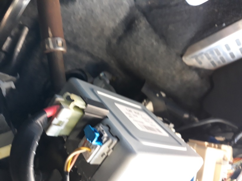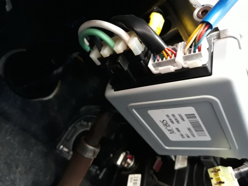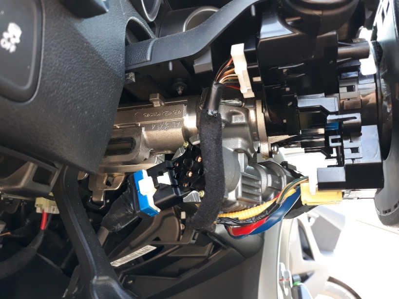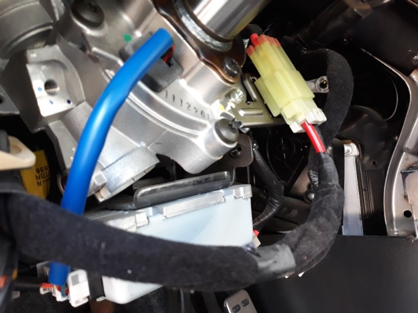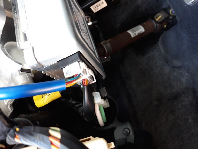 כעת כשמוט ההגה גלוי לעינינו, מנתקים ממחשב ההגה 6 קונקטורים. לאחד מהם יש קליפס אבטחה כחול, צריך לשלוף אותו החוצה קודם לפני שאפשר ללחוץ על הקונקטור ולהוציא אותו.