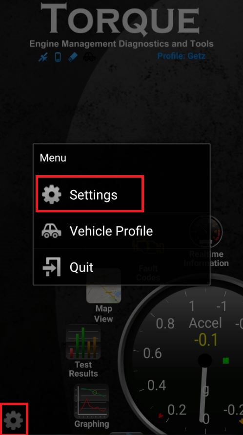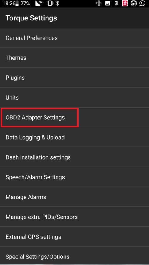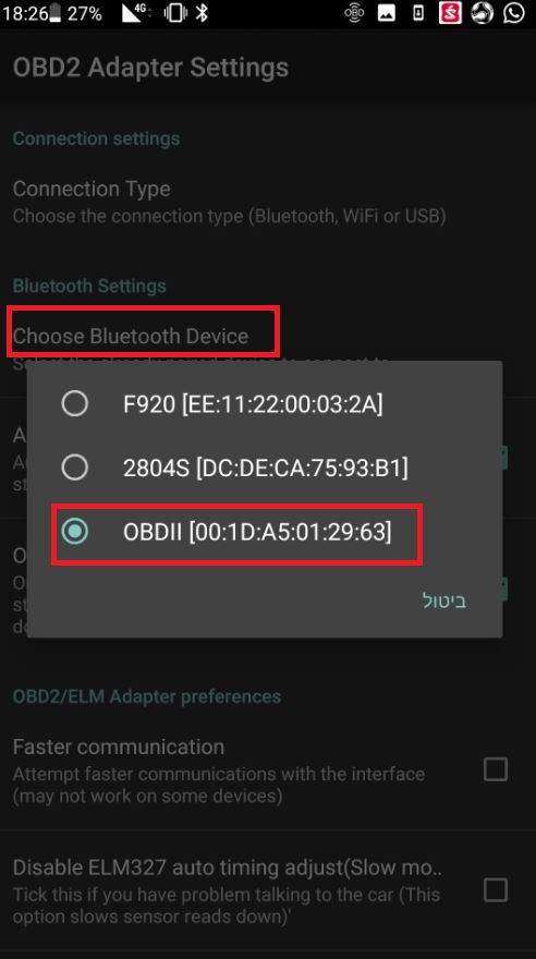 פתחו את האפליקציה, לחצו על גלגל השיניים האפור בצד שמאל למטה, בחרו ב settings ואז ב OBD2 Adapter Settings