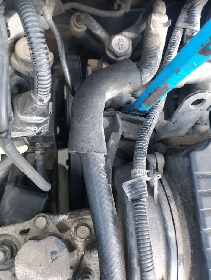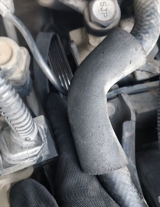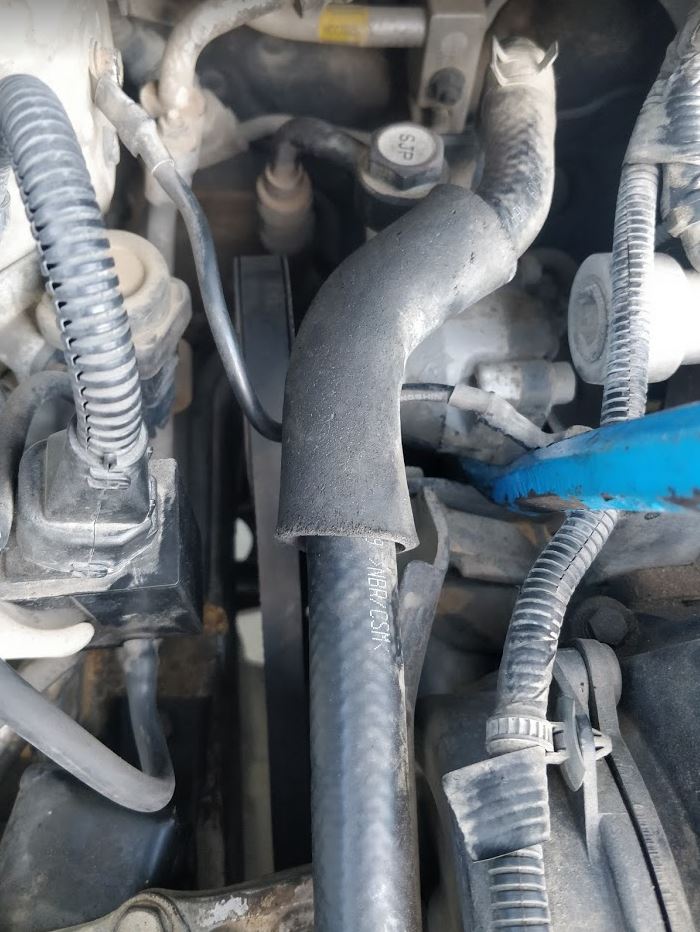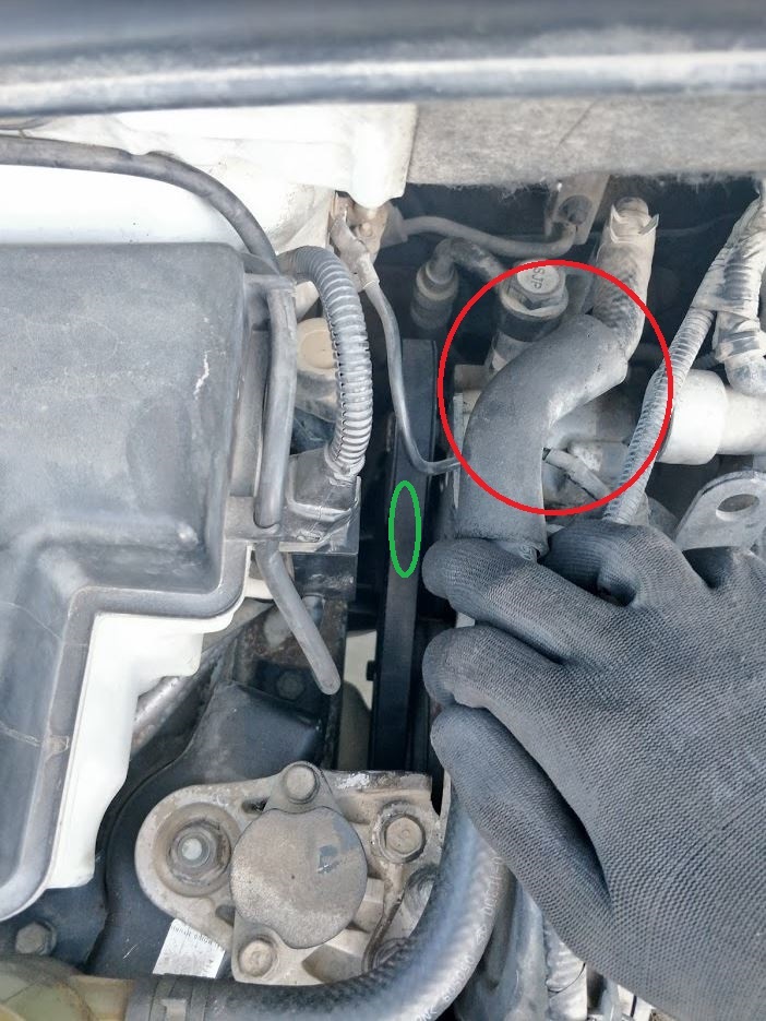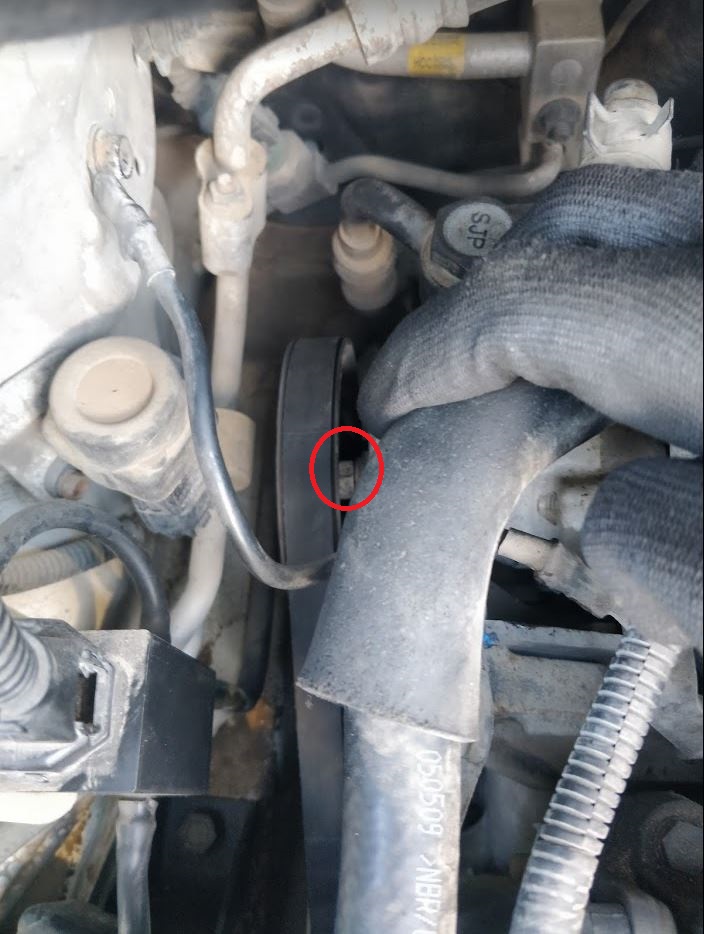 מאתרים את רצועת ההגה (בתמונה בירוק) ומשאבת ההגה (בתמונה נמצאת מתחת לצינור, מוקפת באדום)