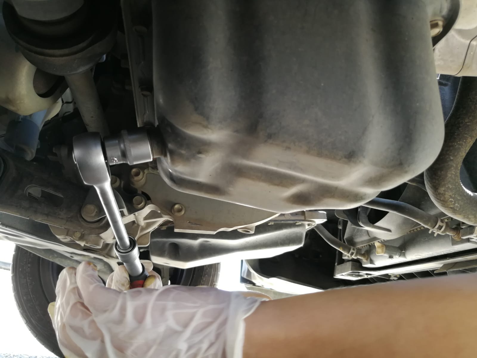 3. ניקח ידית ראצ'ט עם בוקסה 19 לבורג הריקון, נפתח אותו וניתן לכל השמן לצאת החוצה אל תוך הקערה, נחכה כ-2 דקות וניתן לשמן להתרוקן.
