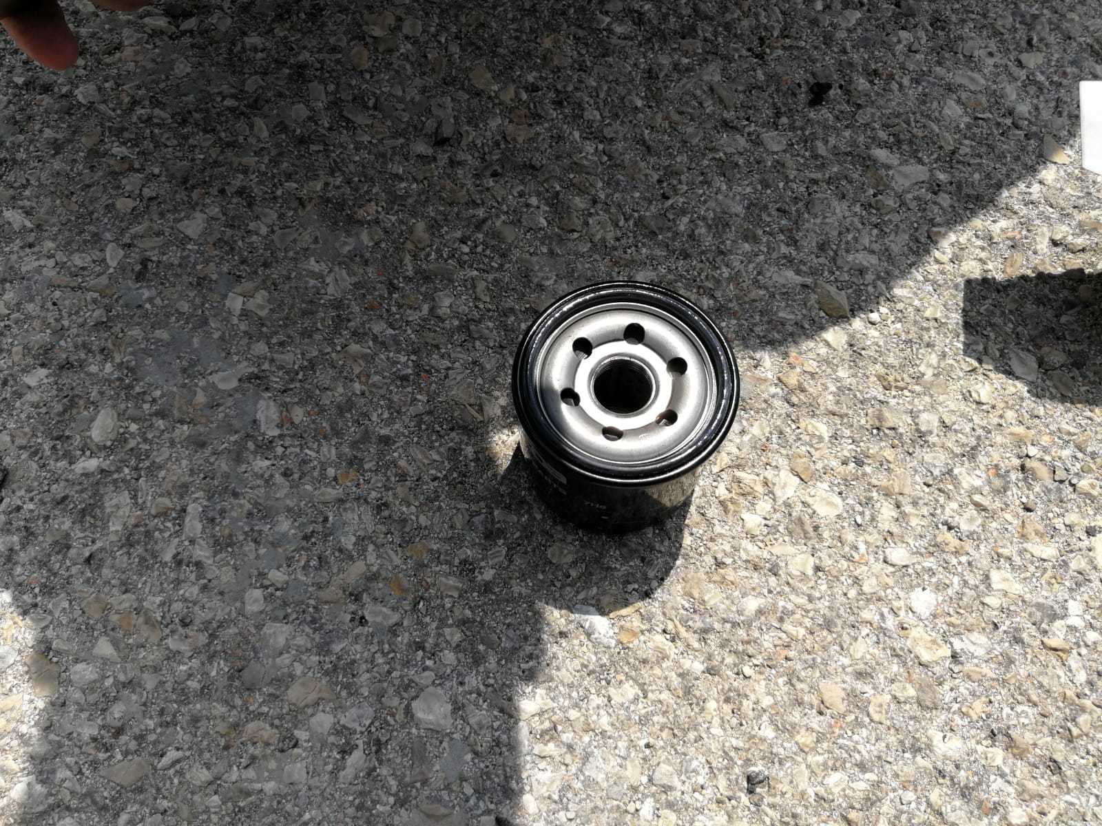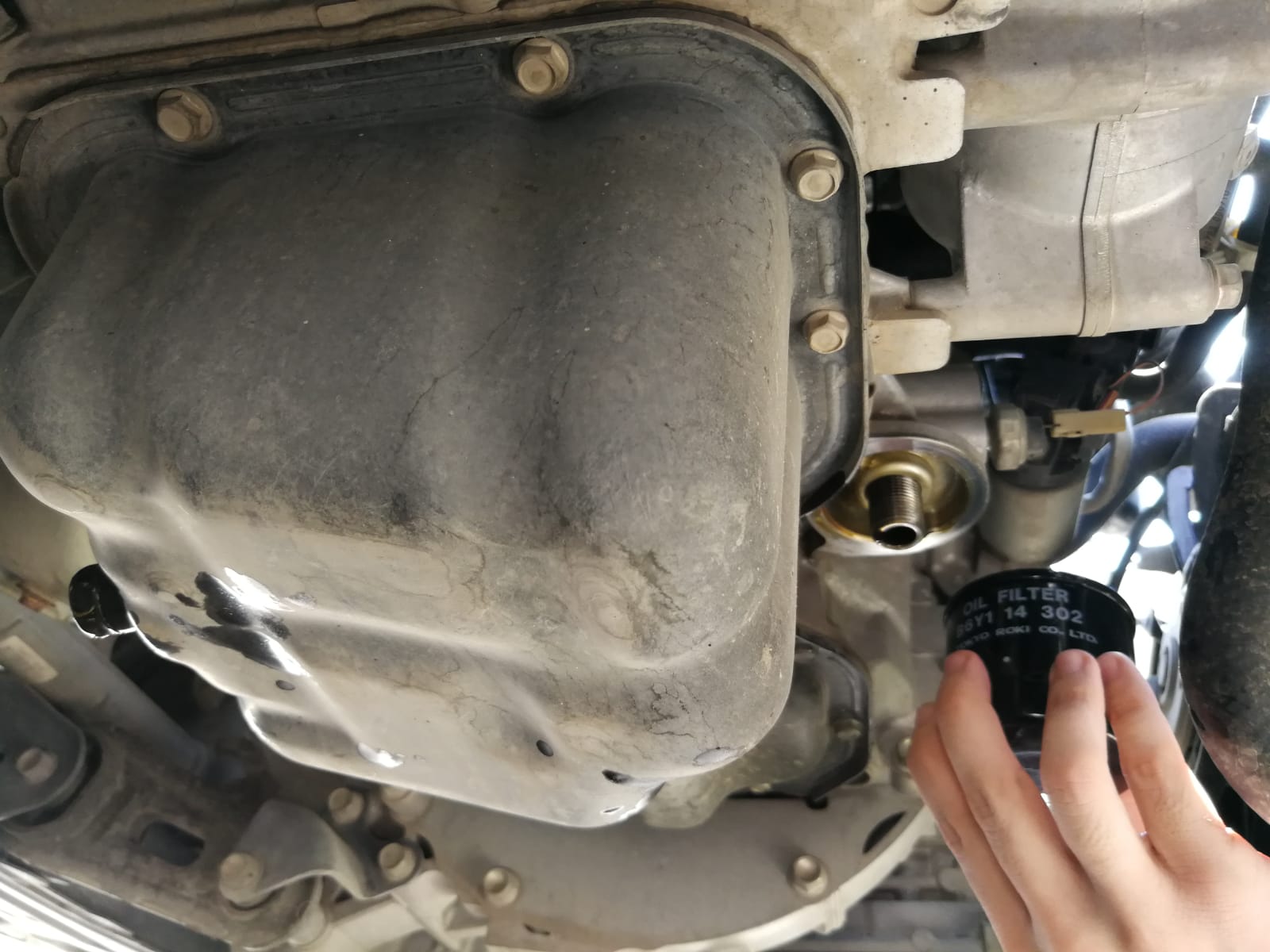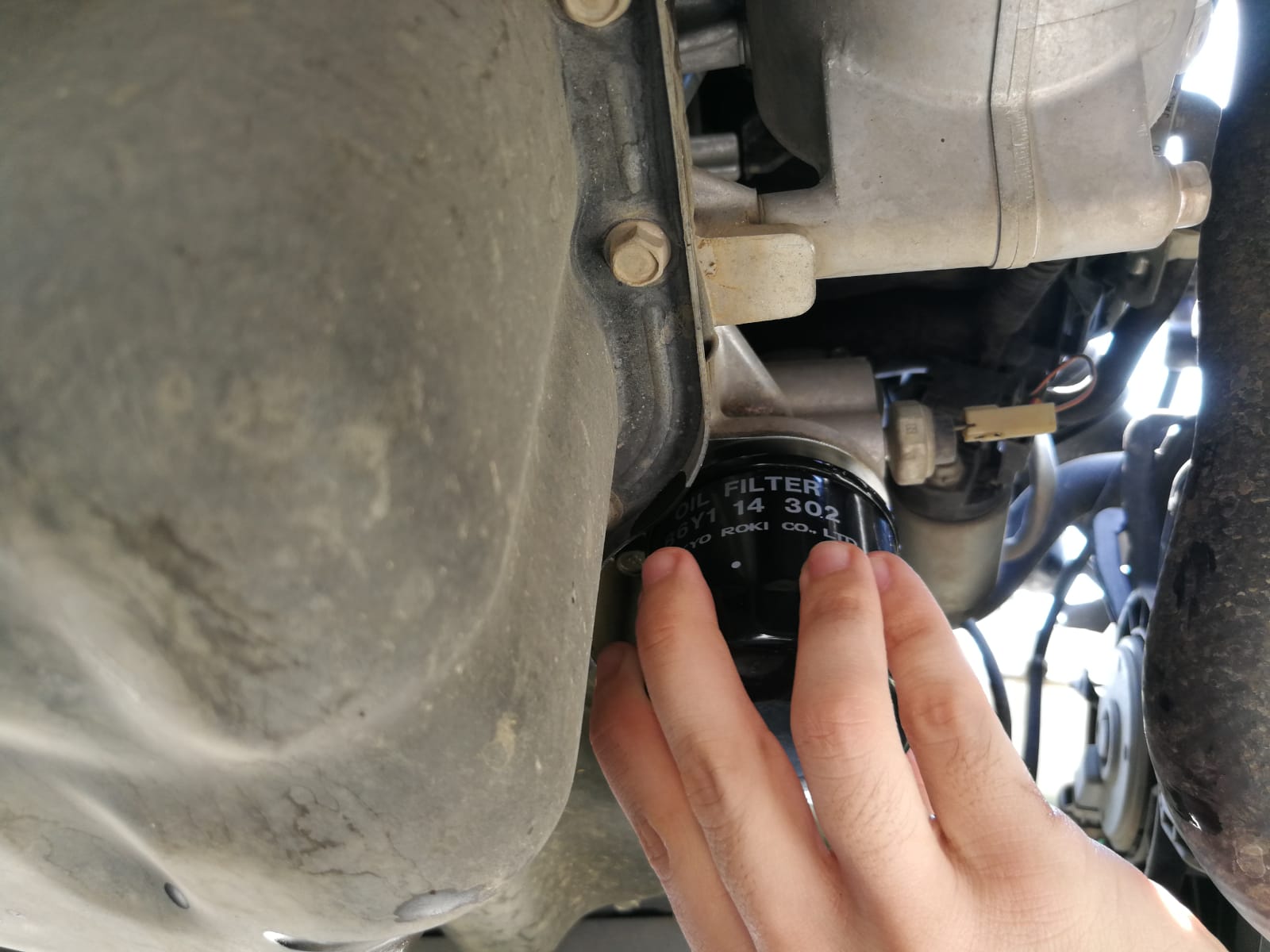 5. נעבור אל פילטר השמן הישן (נמצא קרוב יותר לקידמת הרכב). אני נתתי לו פתיחה קלה על מפתח סרט ואת שאר הדרך עם היד כי הוא לא היה סגור מאוד חזק (כי אני האחרון שסגר אותו). אם הרכב שלכם טופל במוסך יכול להיות שהפילטר יהיה סגור חזק מידי ותיאלצו להשתמש בעכביש או משהו שיתן לכם יותר כוח בהוצאה. נמקח את קערת השמן מתחת לפילטר כי גם משם הולך לצאת שמן, נפתח מעט את פילטר השמן ידניתוניתן לו לטפטף החוצה אל תוך הקערה. כשהוא מפסיק לטפטף נבריג אותו החוצה לגמרי. וננקה עם הסמרטוט את האיזור שהחדש יוברג עליו.