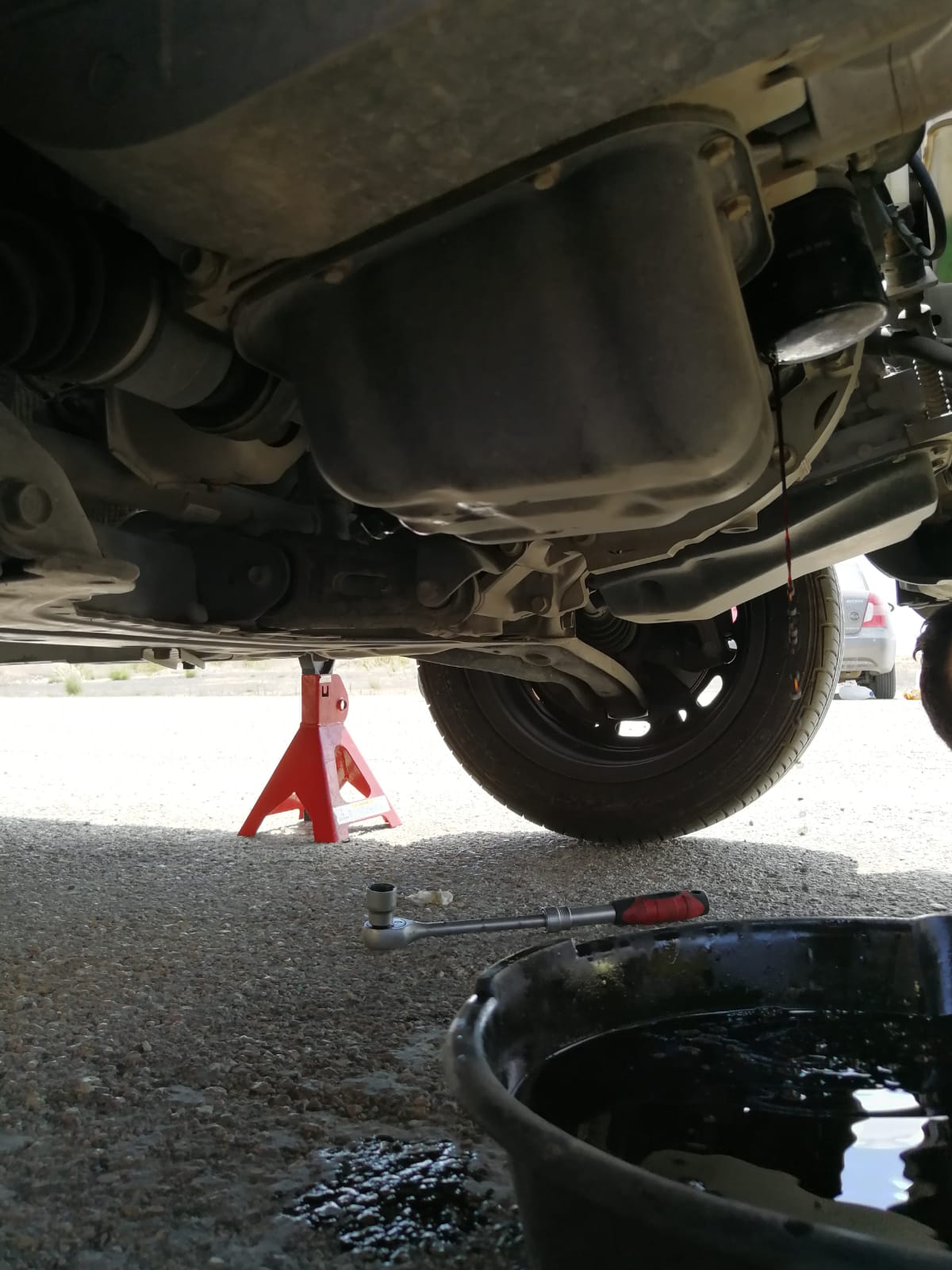 10. ממתינים כ- 3 דקות ובודקים שמן במדיד (כנראה שה-3 דקות עברו כשהורדתם את הרכב מהבוקים), במידת הצורך מוסיפים שמן. (סה״כ נכנס כ- 3.9 ליטר אך לא הכל יוצא + חלק ממלאים בפילטר).