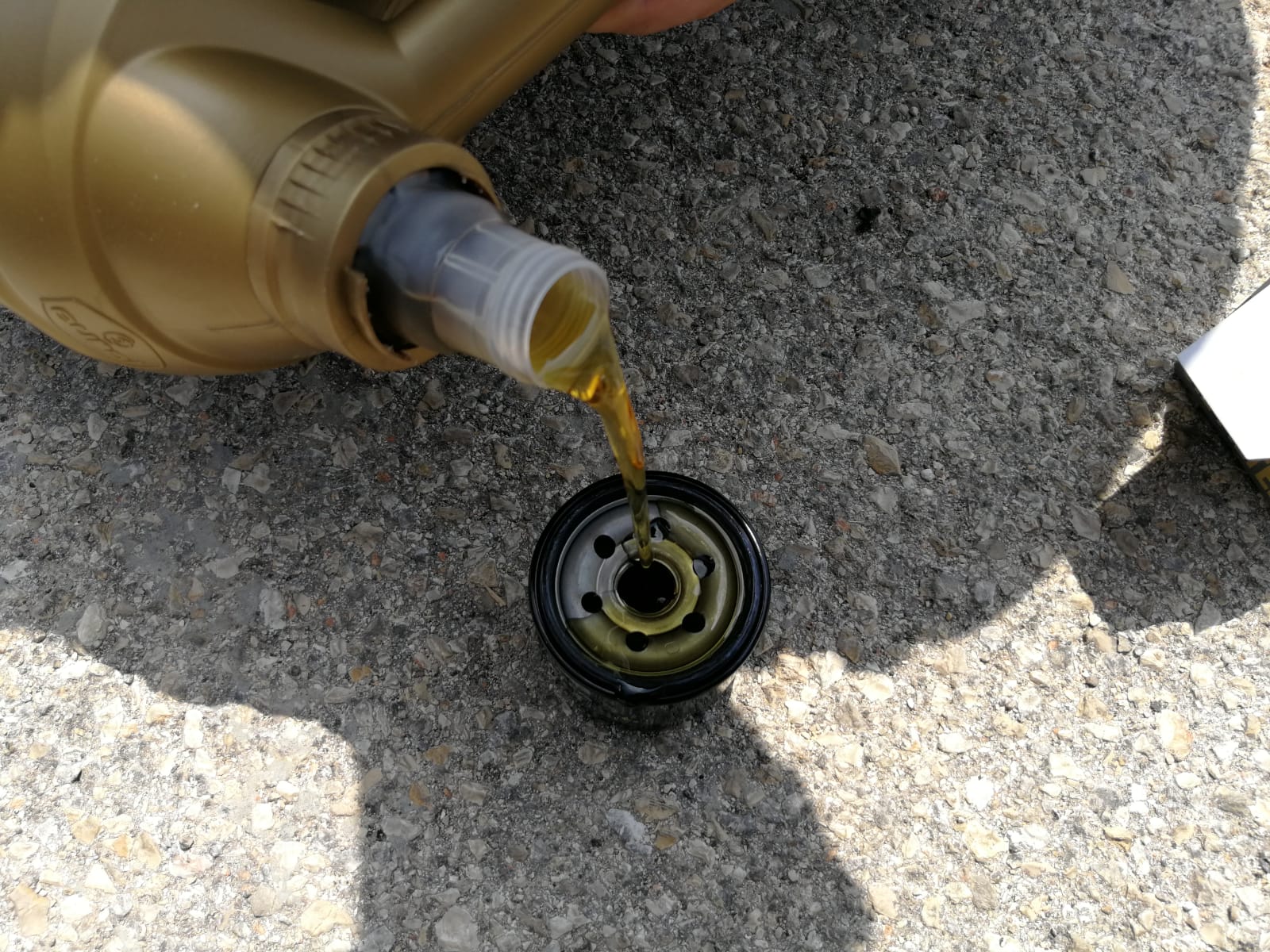 6. ניקח את פילטר השמן החדש, נמזוג לתוכו מהשמן החדש שקנינו ונשמן את הגומיה שלו בעזרת האצבע והשמן החדש.
