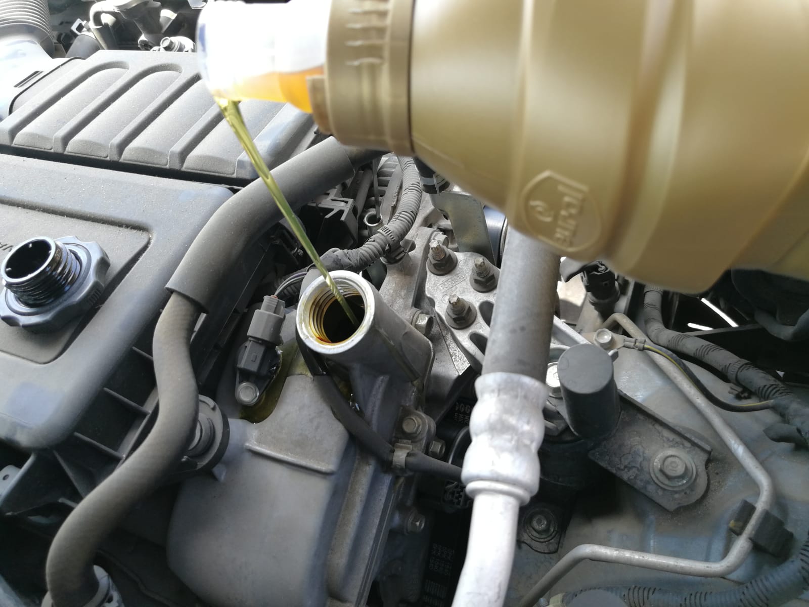 8. נצא ממתחת לרכב, ניקח את השמן החדש ונמלא כ- 3 ליטר. זה הזמן לסגור את פתח המילוי ואת המדיד.