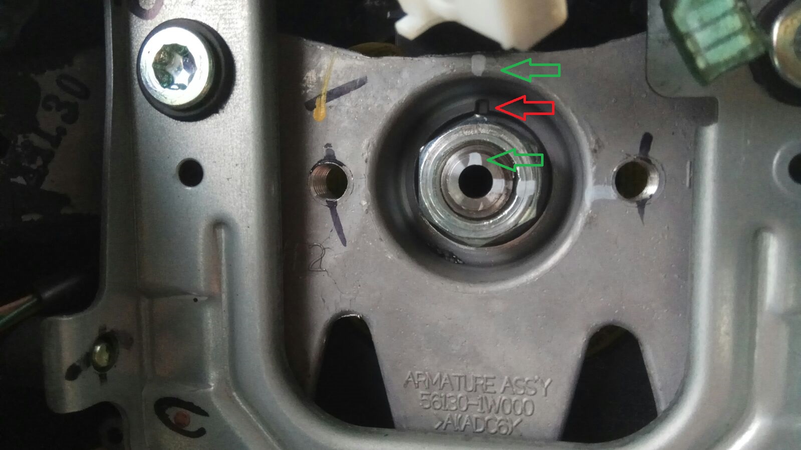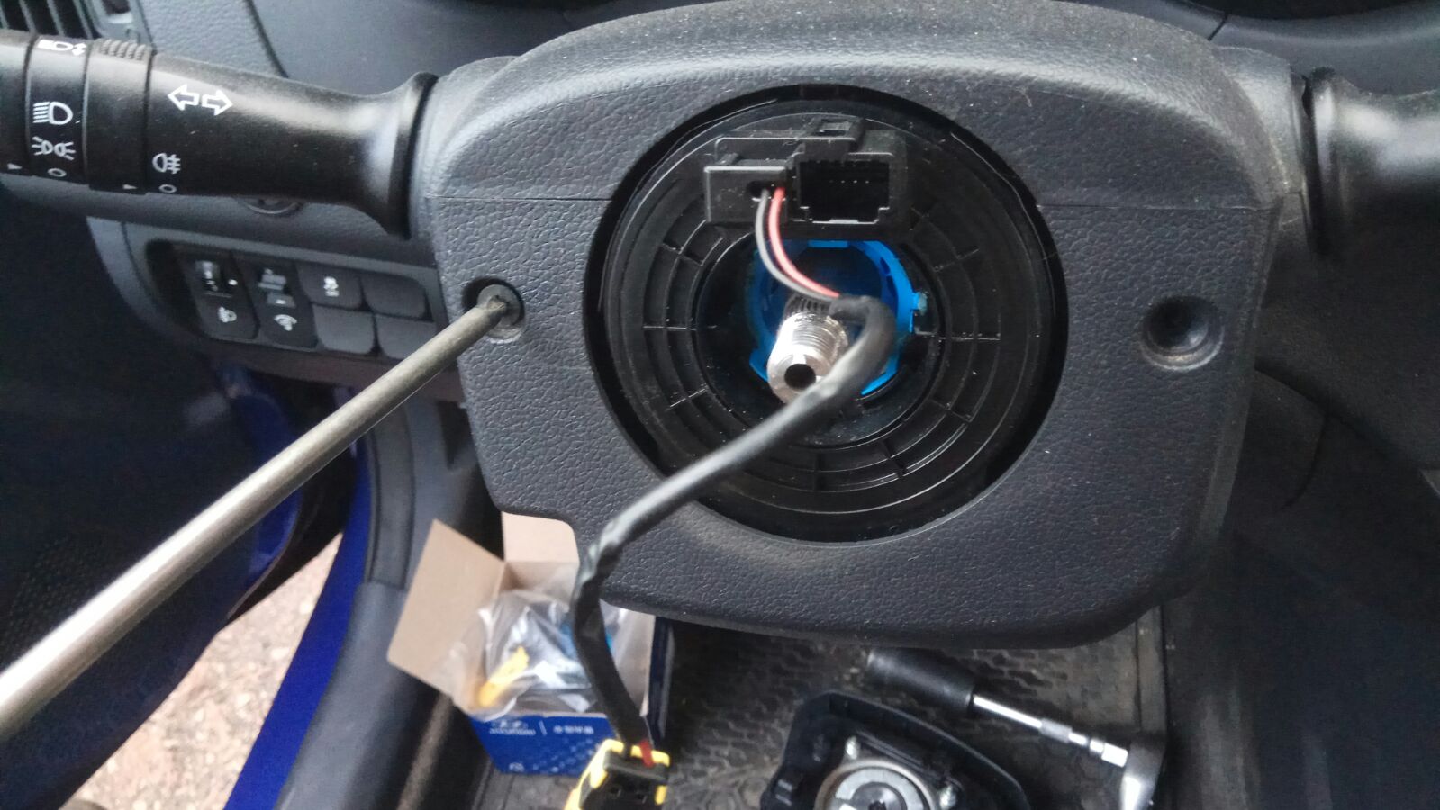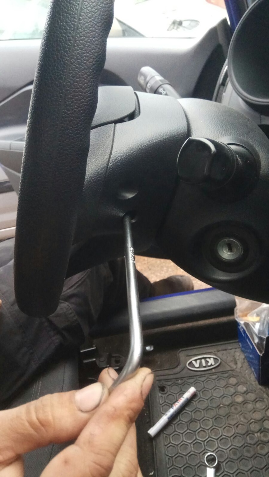 עכשיו נשאר לפרק את ההגה – לא לפני שמסמנים אותו ביחס למוט ההגה כדי שנוכל להחזיר אותו לאותה נקודה.