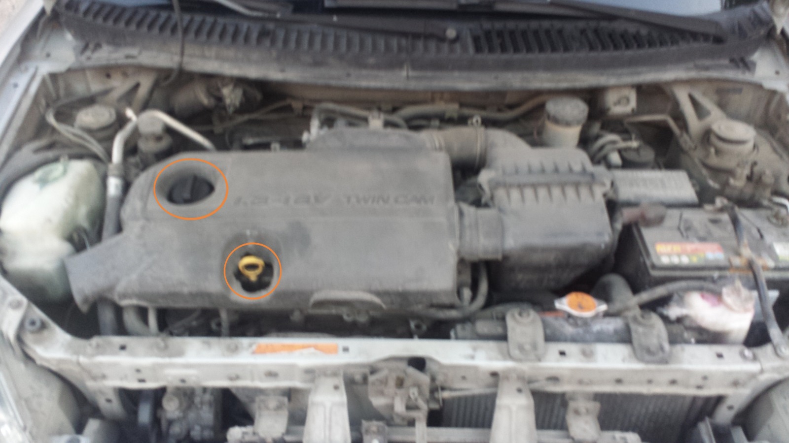 הרם מכסה מנוע ותפתח את פקק המילוי ומדיד השמן, והנח אותם בצד. (מסומנים בעיגול כתום בתמונה למטה)