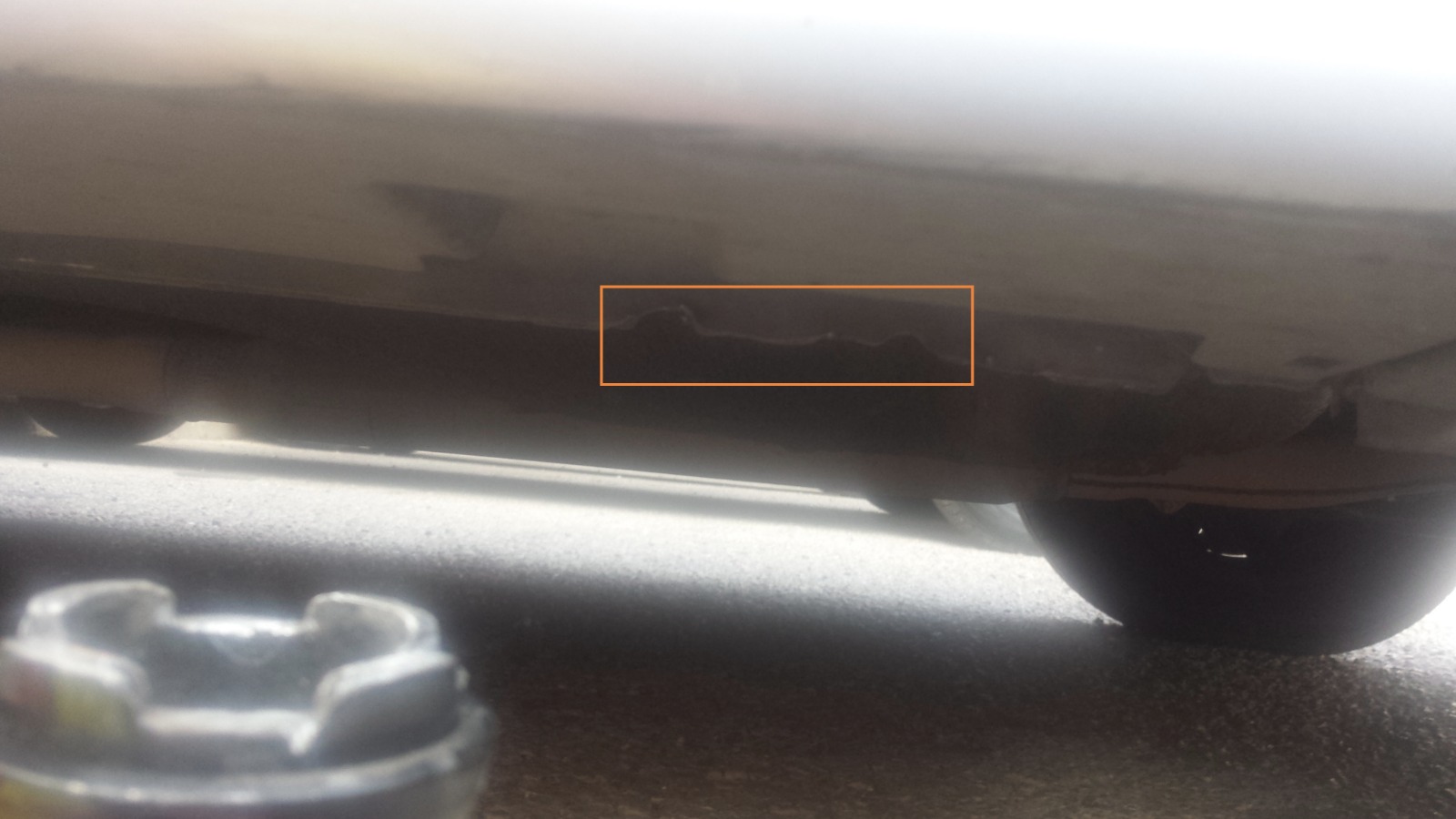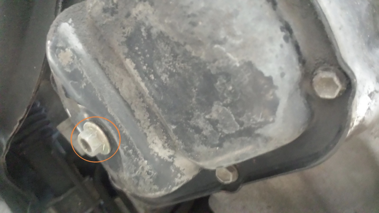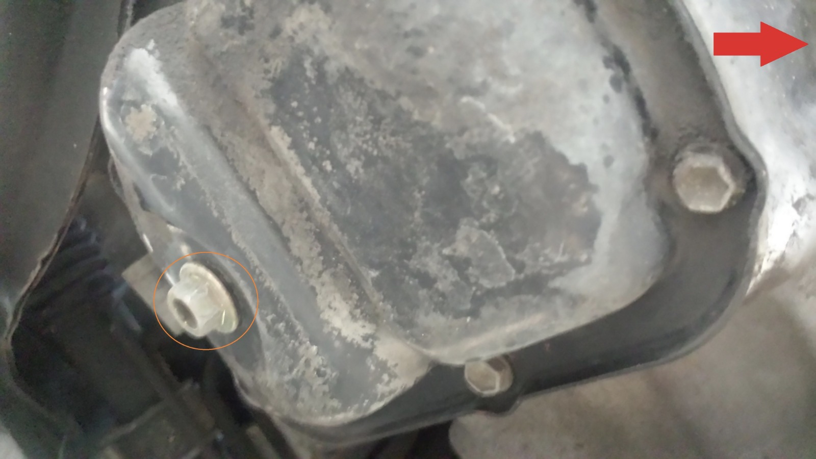 כנס מתחת לרכב, שכב על הגב והבט אל המנוע מלמטה. התקרב לגלגל הנמצא מימנך, ואתה תראה את קרטר השמן (מופיע בתמונה למטה). אחוז את הראצ'ט הטלסקופית, "פתח" אותה עד הסוף (המצב בו הידית הכי "ארוכה"), הלבש בוקסה 14מ"מ ופתח את בורג הריקון (מסומן בעיגול כתום בתמונה למטה)