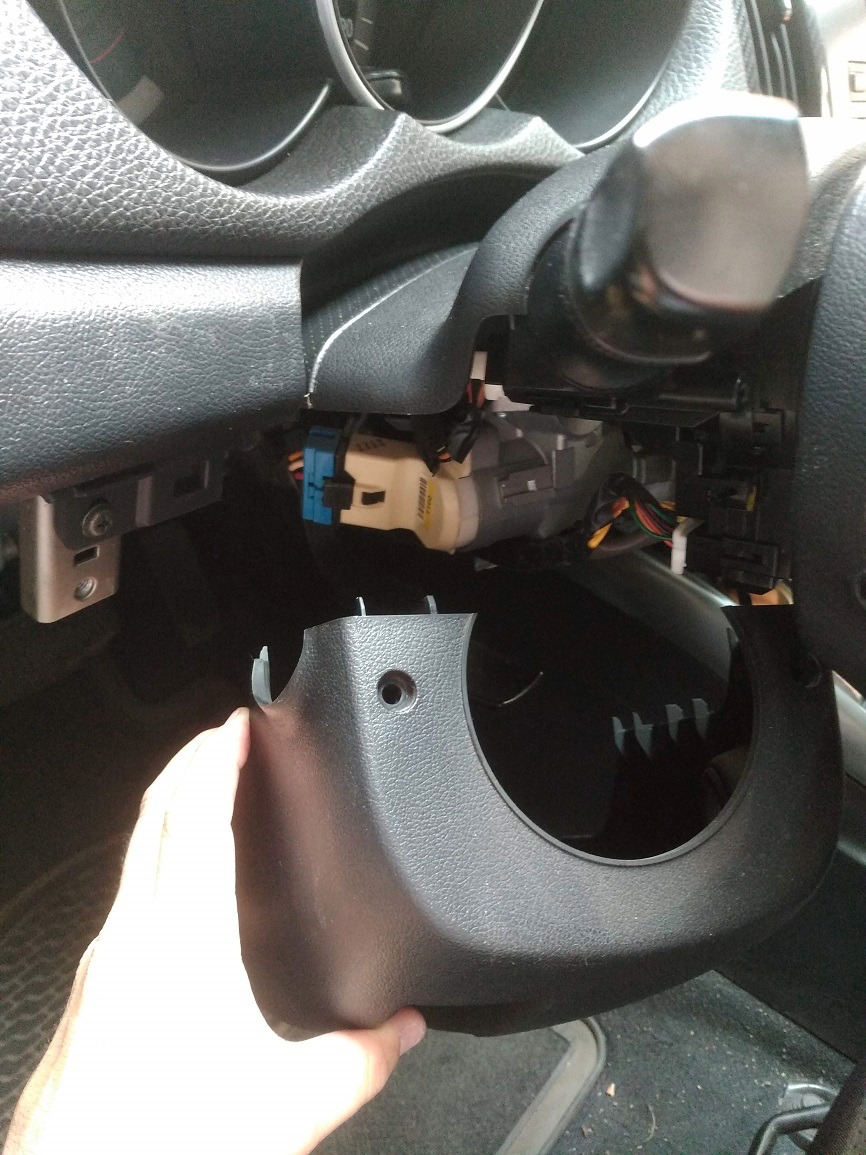 – מסובבים את ההגה עד לנעילה ומפרידים בן חיפויי הפלסטיק מאחורי ההגה, חשוב לשים לב שלא מושכים חזק מידיי שלא ישברו הקליפסים בחלקים. משחקים ולוחצים בעדינות על שני החיפויים עד שמצליחים למפרידים בניהם, החיפוי התחתון יוצא ומניחים אותו בצד ואת החיפוי העליון מדביקים עם סרט דביק ללוח השעונים שלא יפריע.