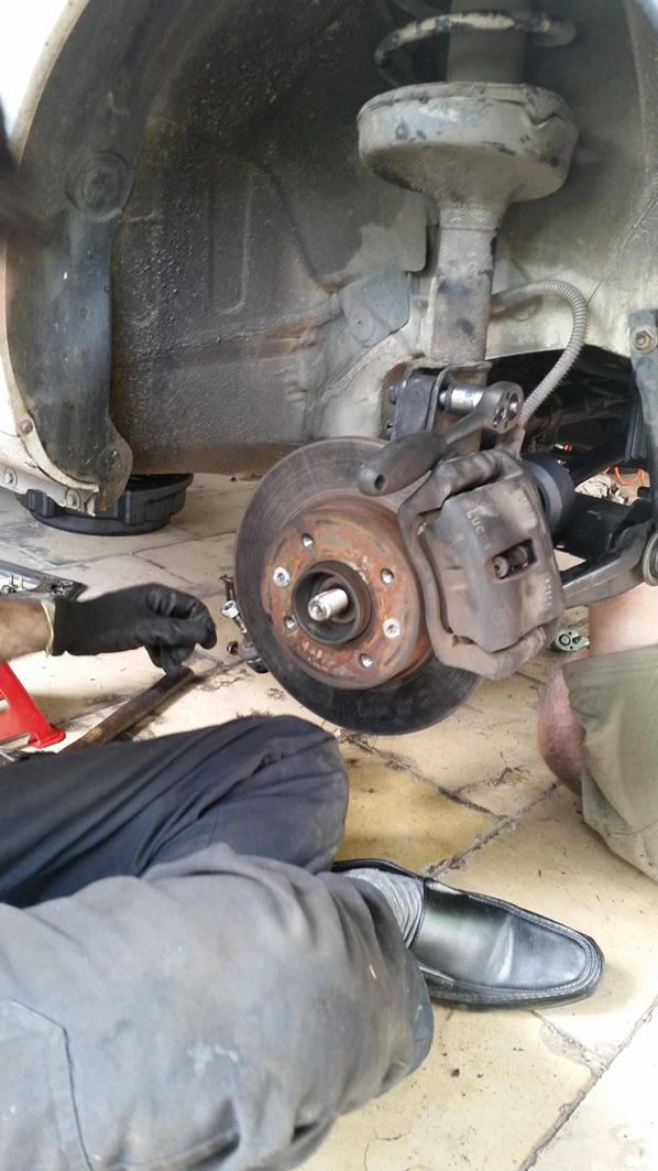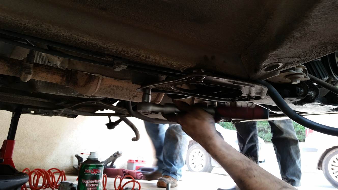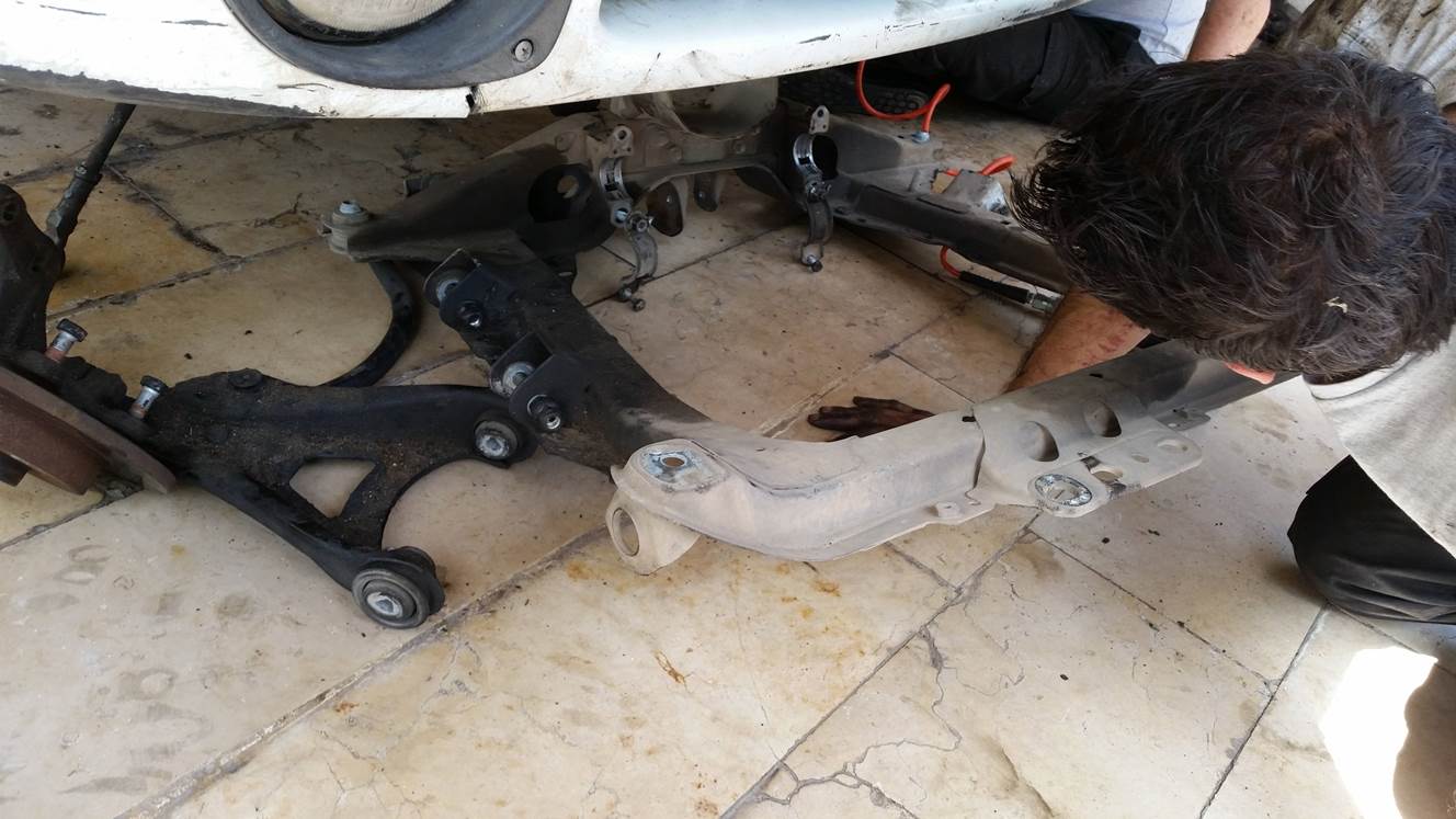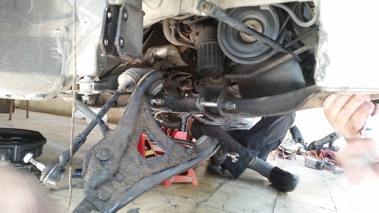 הרכבת הציריות וסגירת שלושת הברגים של הציריה בצד הנהג, הרכבה של תפוחים, מוט מייצב, ברקסים,בולמים ואום מרכזי.