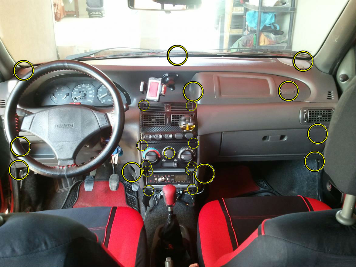 מפתח אלן 3 מ"מ (כל הקונסולה המרכזית – מאפרה, יחידת מתגים של המיזוג ומפתחי המזגן, מכסה פלסטיק של ההגה, רשתות רמקולים)