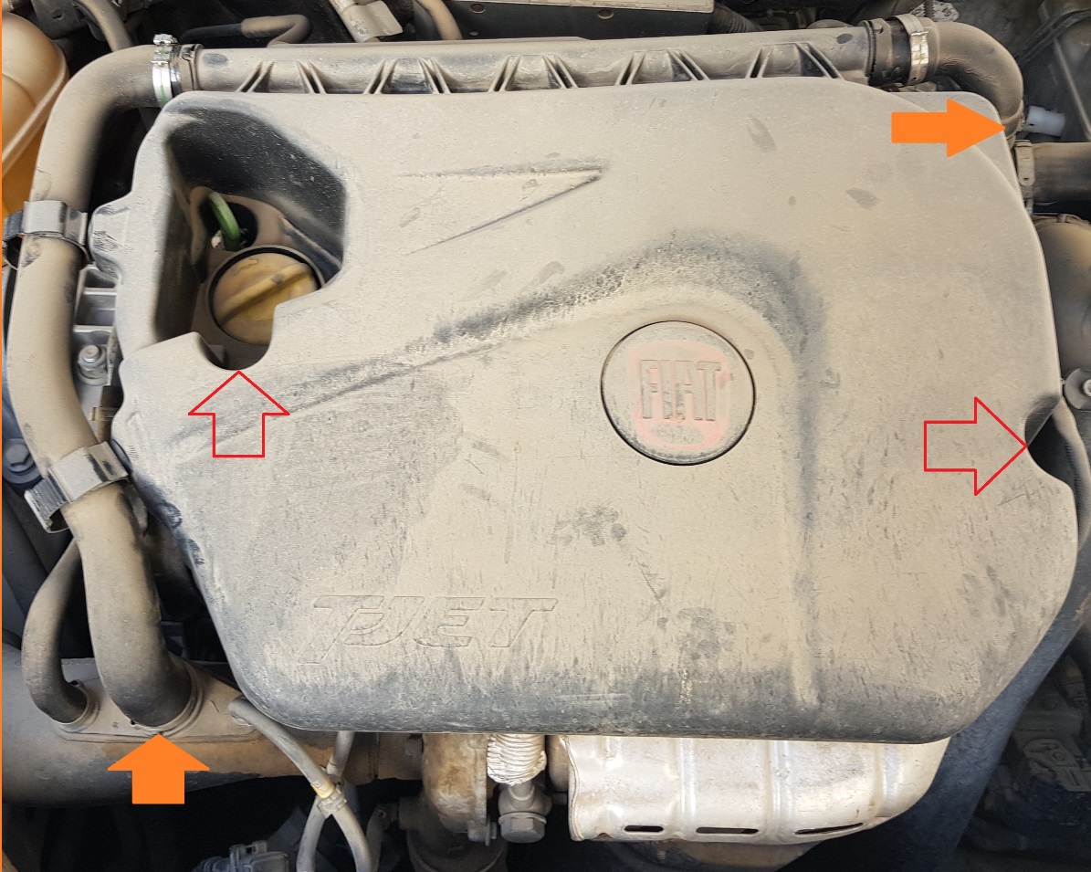 מפרקים חיפוי מנוע עליון, קודם כל פותחים שני בירגי 10 מ"מ(חצים אדומים) ופותחים שני באנדים של צינור פורק לחץ (חצים כתומים). לאחר מכן מרימים את החיפוי למעלה. בחלק האחורי של החיפוי ישנה גומיה שיש לשחק איתה עד שהיא משתחררת.