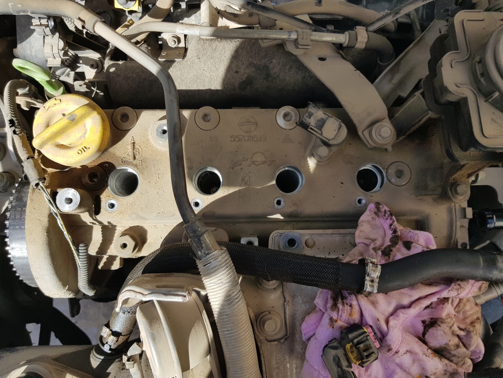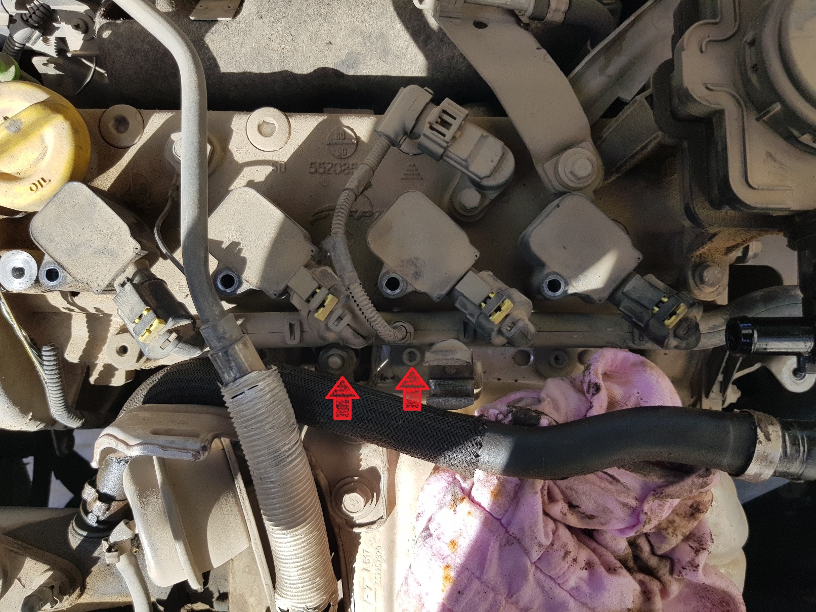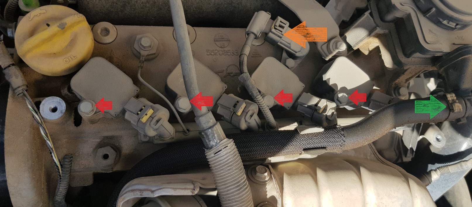 משחררים את ברגי ה10ממ של הקויילים (חצים אדומים). מנתקים את החיבור לחיישן זוית קאמשאפט (חץ כתום). מנתקים את צינור הנשם (חץ ירוק) ומסיטים אותו מעט הצידה.