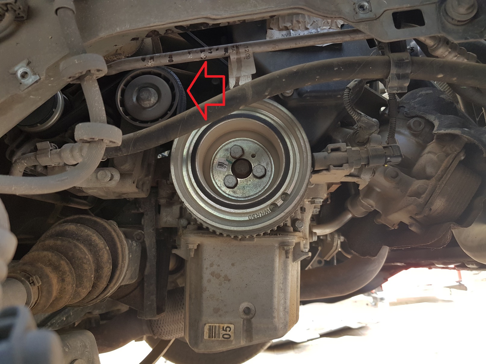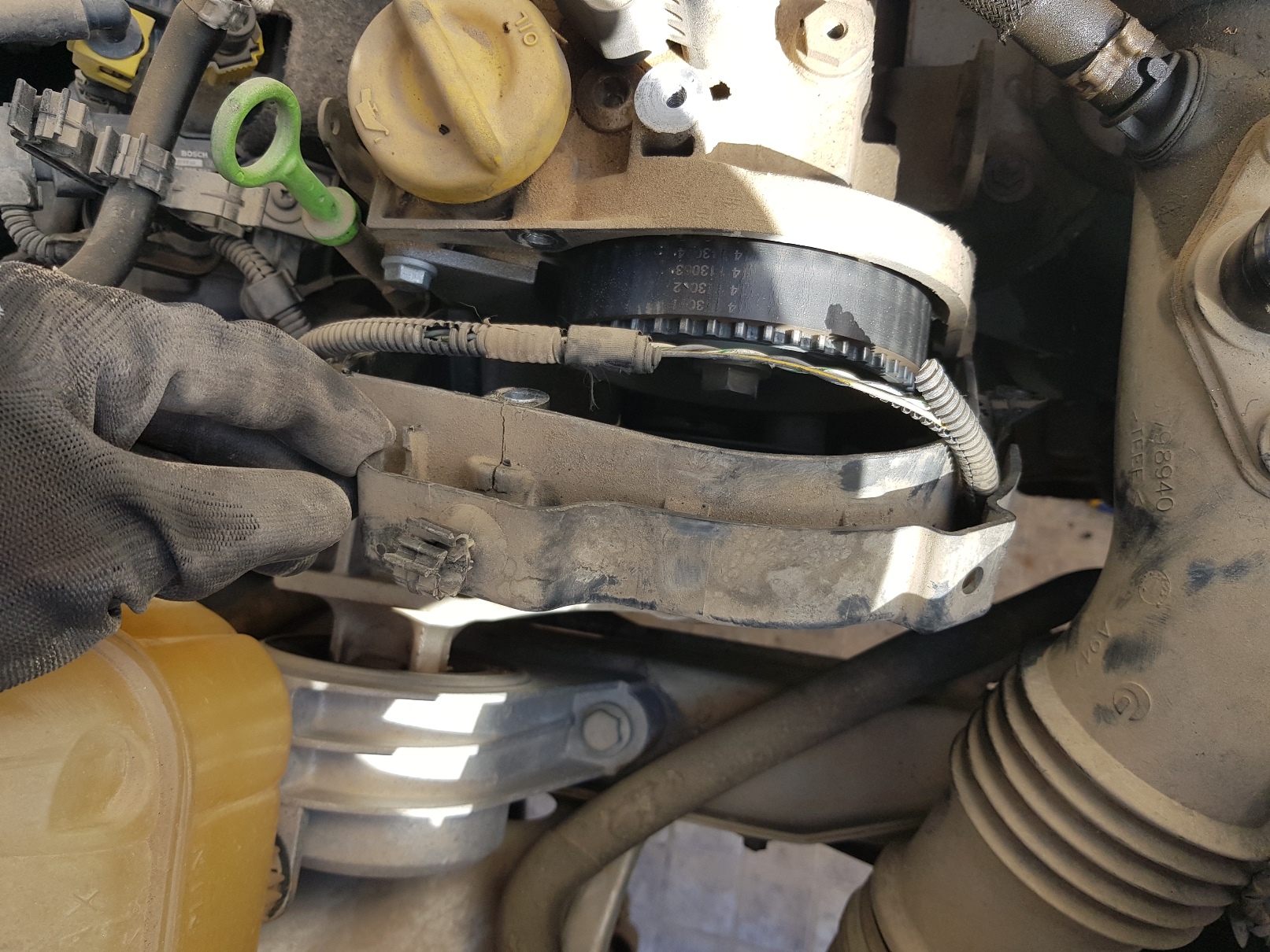 כעת רצועת הטיימינג גלוייה לנו, ואנו מבינים שאין דרך להוציא אותה מבלי לפרק את תושבת המנוע.