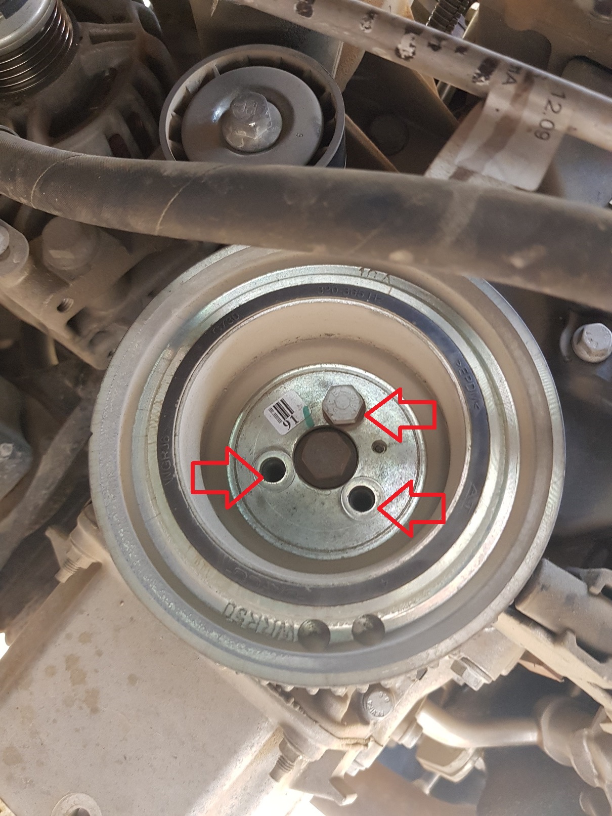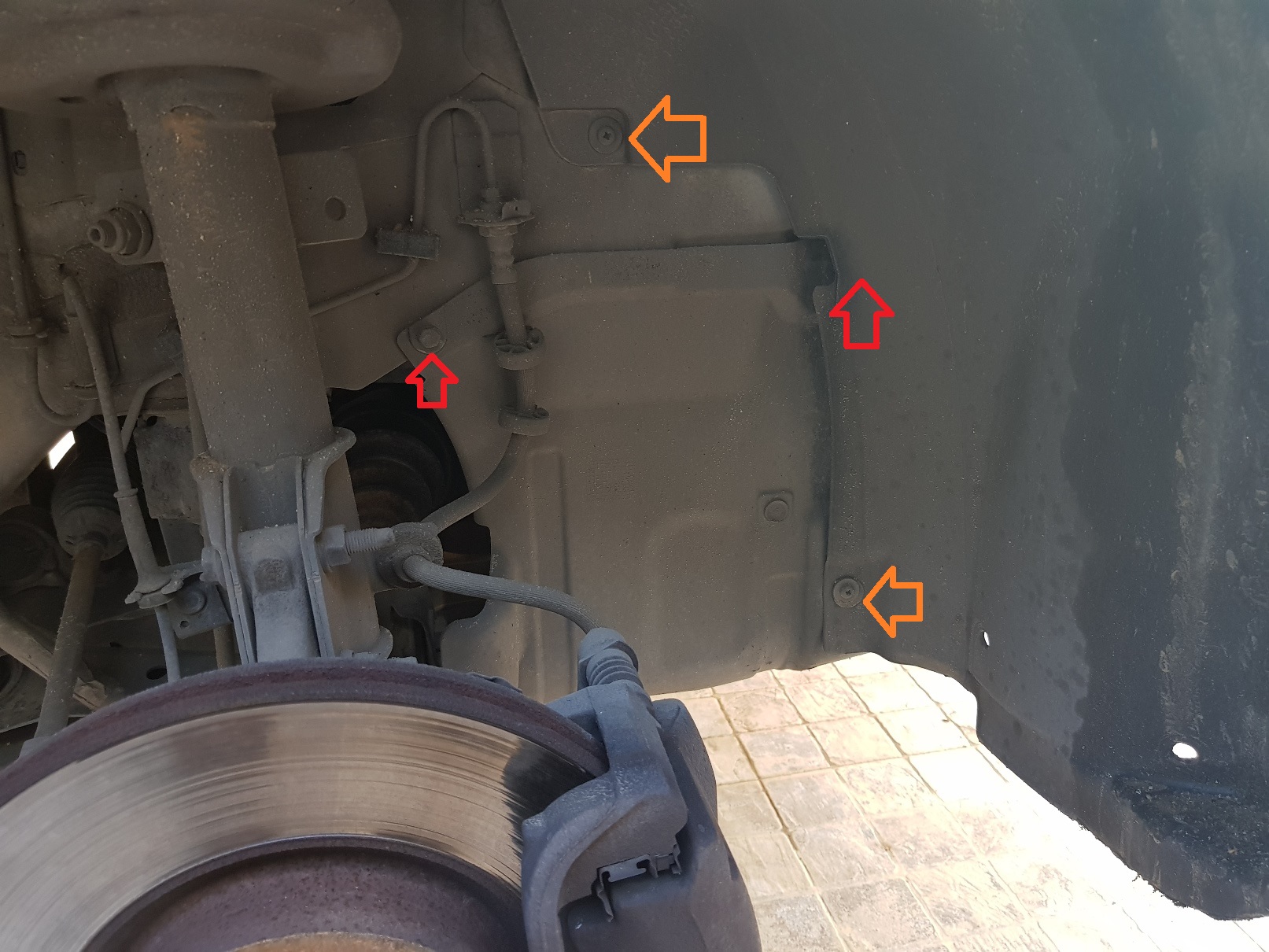 מרימים את החלק הקידמי של הרכב באויר עם ג'ק ותומכים את הרכב עם בוקים. מורידים את הגלגל הקידמי ימני. מפרקים חיפוי תחתון, חיפוי גלגל קידמי ימין, וחיפוי גלגלת קראנק. כל החיפויים הללו תפוסים על ידי תפזורת ברגי פיליפס וברגי 10 ממ. לצערי צילמתי רק את החיפוי של גלגלת הקראנק וחלק קטן מחיפוי הגלגל.