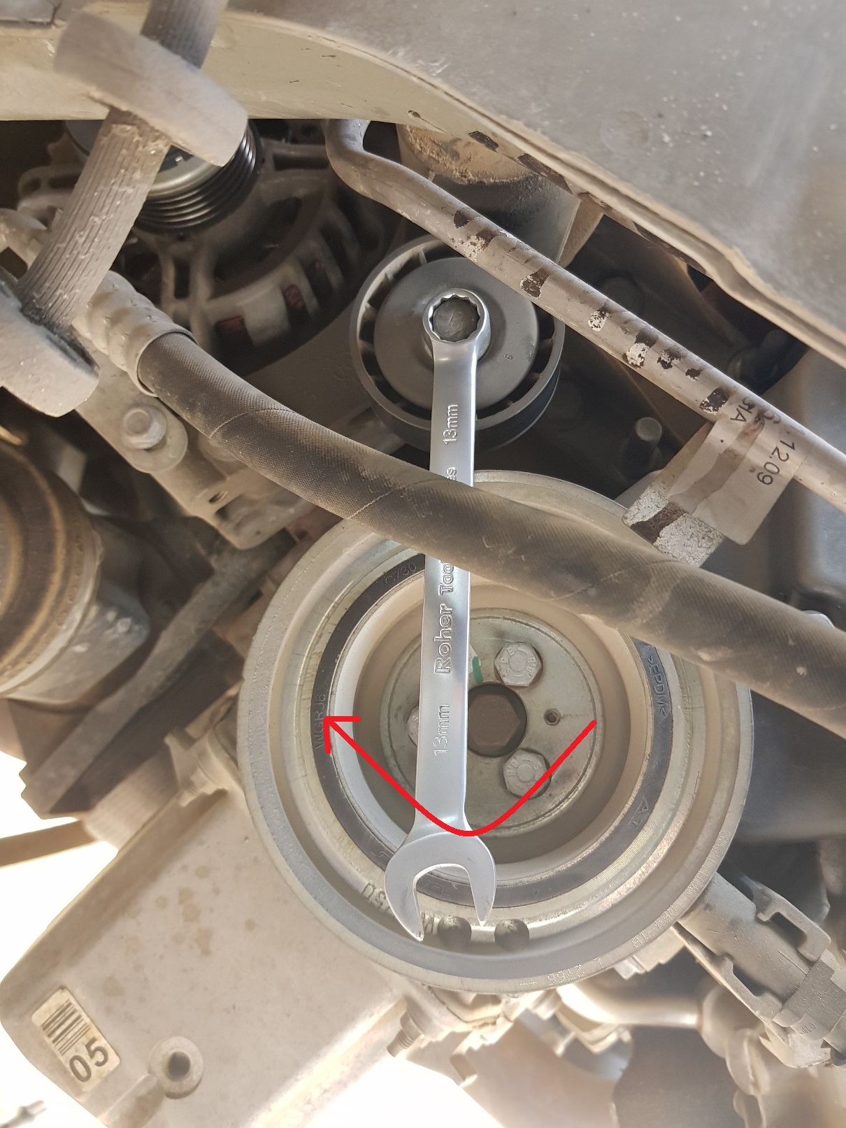 מאתרים את המותחן של רצועת האביזרים. שמים אליו רינג 13ממ ומסיתים אותו עם כיוון השעון על מנת לשחרר את מתיחות הרצועה. מורידים את הרצועה ומשחררים בעדינות את המותחן.