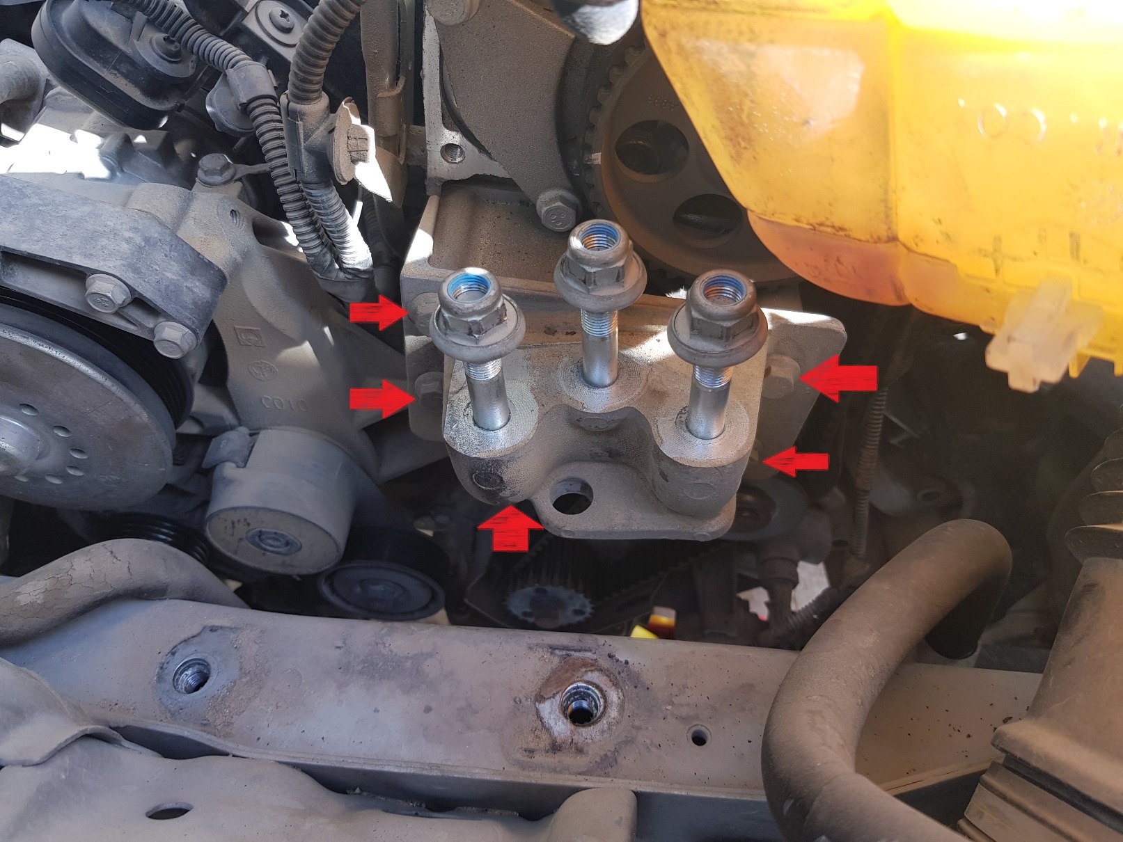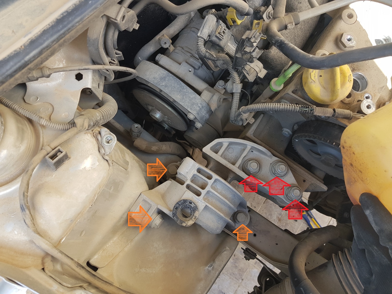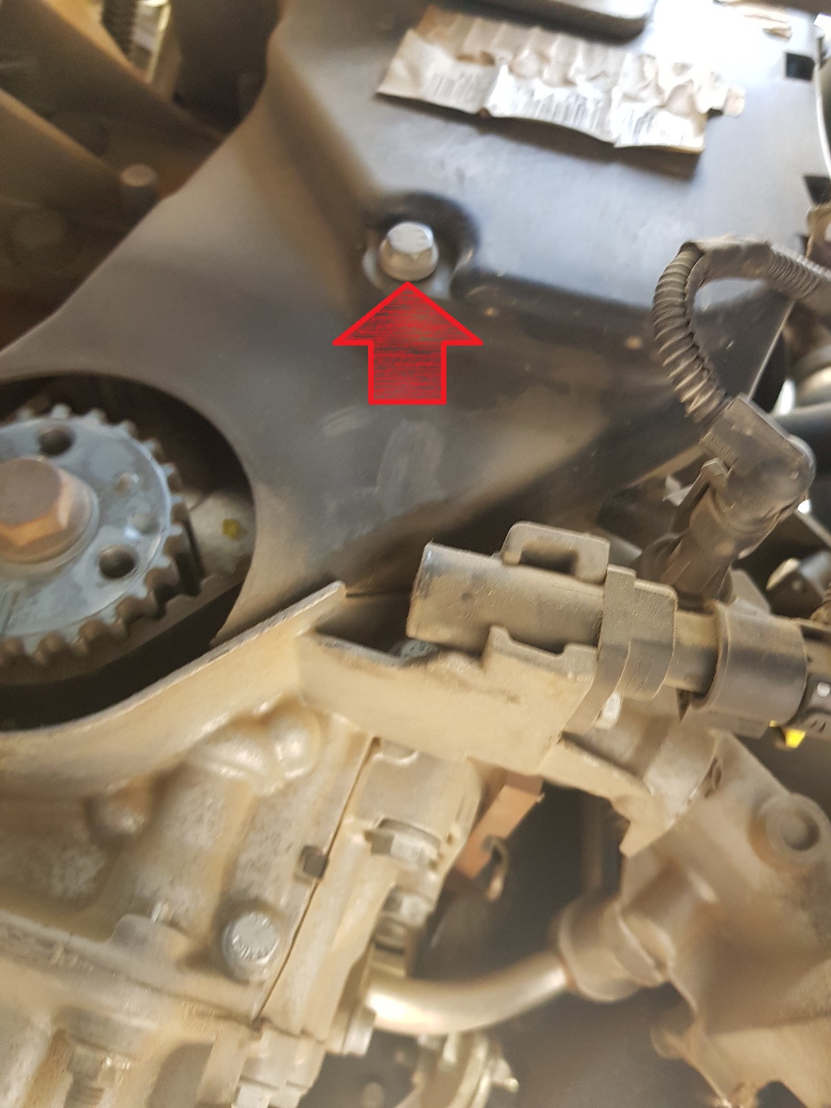 עובדים לצד הימני של המנוע (צד נוסע), משחררים את הברגים של מכסה טיימינג עליון. הבורג הימני הוא 10 ממ (חץ כתום), והשמאלי 13 ממ (חץ אדום). מפרידים בעדינות את צמת החשמל מהמכסה ומוציאים את המכסה כלפי מעלה.