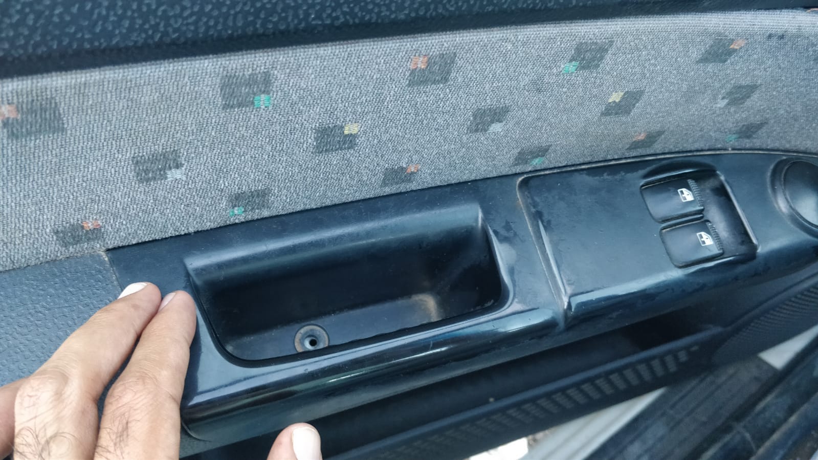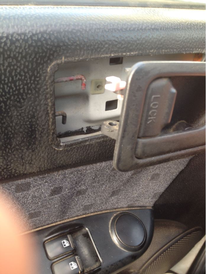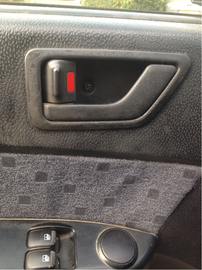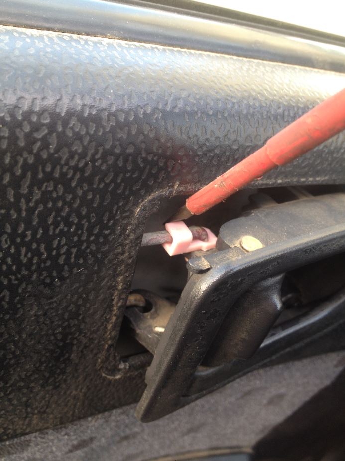 נעבור לפירוק הידית של הדלת. נוציא את הבורג, נמשוך את מסגרת הפלסטיק תוך כדי הזזת כפתור הנעילה לנעילת הרכב, נוציא מווי הברזל את הקליפסים בעזרת מברג שטוח, נרים כלפי מעלה את הווים ונוציא אותם ממקומם.