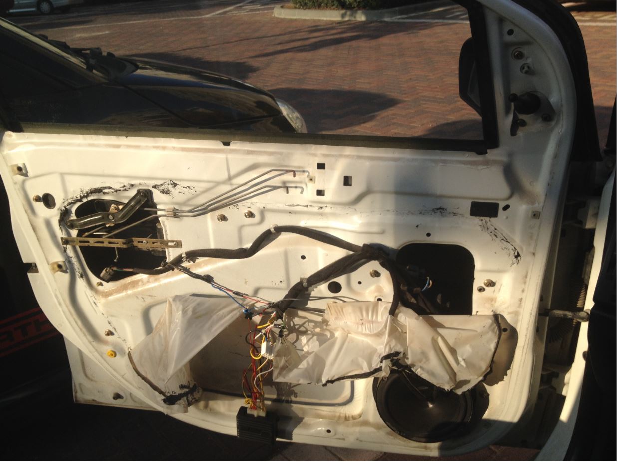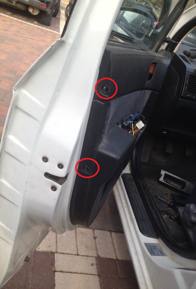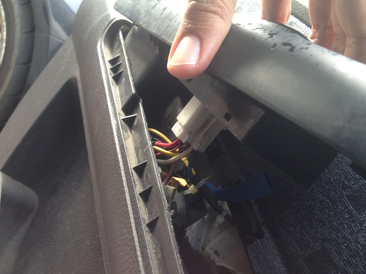 נוציא עוד בורג שנמצא בתוך התא הקטן שבדלת, לאחר שנפתח אותו נרים את הפלסטיק בכוח וננתק את הקונקטור ממנגנון הפיקוד של החלונות