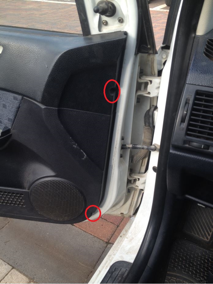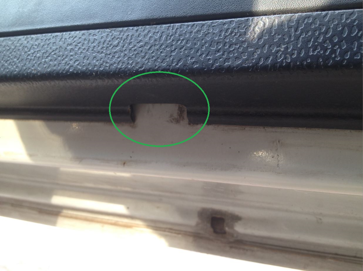 נוציא את 4 הברגים הנותרים שתופסים את דיפון הדלת. לאחר מכן נגשש עם היד בחלק התחתון של הדיפון עד שנרגיש שקע קטן (בתמונה מוקף בירוק), נתפוס אותו ונמשוך אלינו. זה ישחרר את הדיפון מהקליפסים שתופסים אותו, ולאחר מכן נוכל להוריד את כל הדיפון בעזרת תפיסתו משני הצדדים ומשיכתו כלפי מעלה.