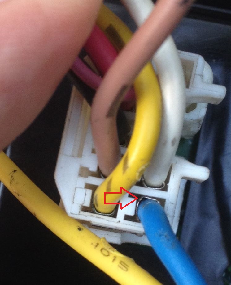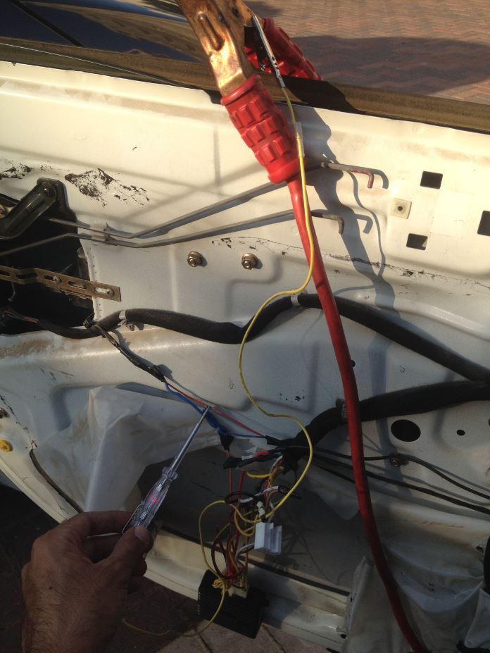 כמו מקודם, נצטרך למצוא בעזרת טסטר איזה חוט עושה מה. חוץ משני חוטים שתמיד עושים אותו דבר (אדום מעביר פלוס קבוע ושחור מינוס קבוע, זה החשמל של המנגנון), נצטרך לגלות את החוט שאחראי על העלאת חלון הנהג ואת החוט שאחראי על העלאת חלון הנוסע (ולמי שיש חלונות חשמל מאחורה- גם חוט העלאת חלון נוסע ימני וחוט העלאת חלון נוסע שמאלי). חוטים אלו מעבירים פלוס. לכן נחבר את התנין של הטסטר למינוס מהשלדה ואת קצה הטסטר נתקע בתוך הקונקטור במקביל לכניסה של החוט ככה שיגע בטבעת המתכת שמקיפה אותו כמו שרואים בתמונה, מסומן בחץ אדום. עכשיו נלחץ על העלאת חלון מסויים. נדלק הטסטר? מעולה. נרשום בצד את צבע החוט ואיזה חלון הוא מעלה. לא נדלק הטסטר? לא נורא, נעבור לאחרים
