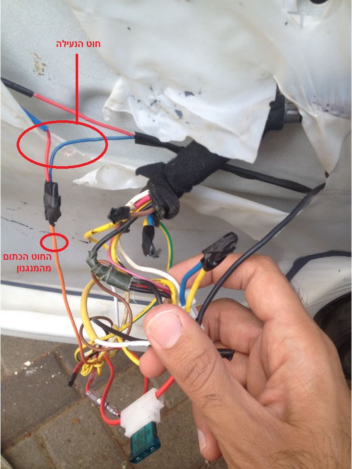 את החוט האחראי על העלאת חלון נוסע שמאלי (שמאחורי הנהג) נחתוך באמצע ונחשוף את שתי הקצוות שלו. את הקצה שמגיע מהקונקטור נחבר לחוט האדום שבמנגנון. את הקצה השני נחבר לחוט האדום-שחור (נמצא מאחוריו) שבמנגנון.
