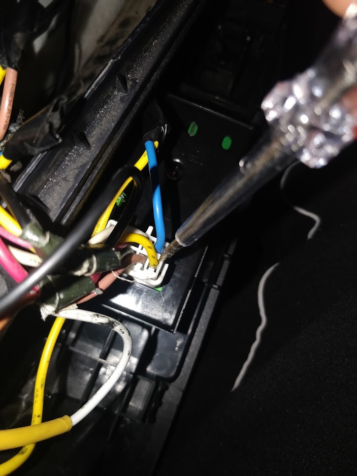 את החוט האחראי על העלאת חלון הנהג (אצלי הוא כחול) נחתוך באמצע ונחשוף את שתי הקצוות שלו. את הקצה שמגיע מהקונקטור נחבר לחוט הצהוב שבמנגנון. את הקצה השני נחבר לחוט הצהוב-ירוק (נמצא מאחוריו) שבמנגנון.