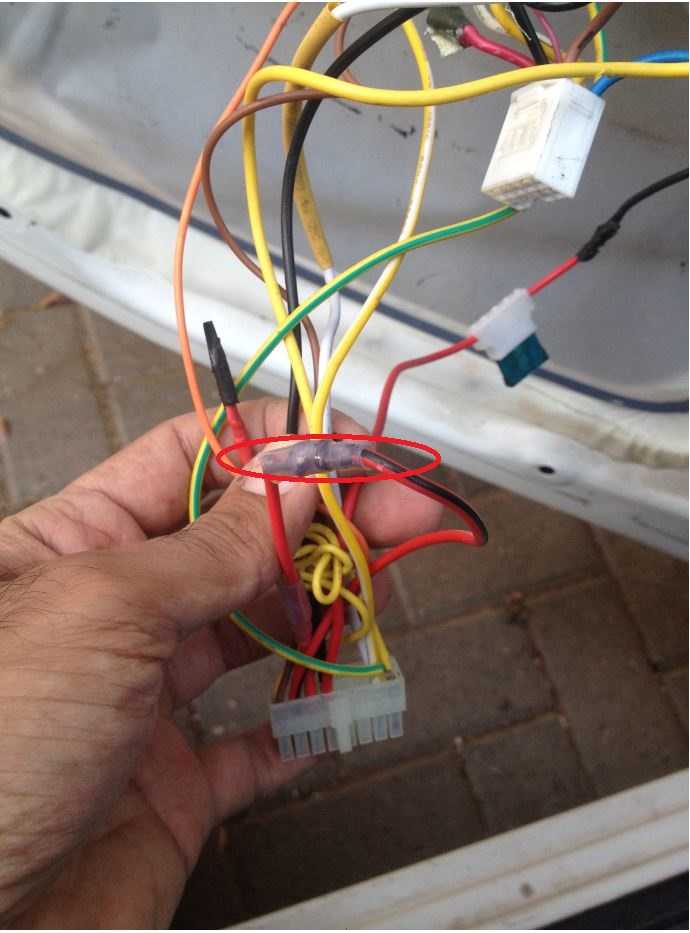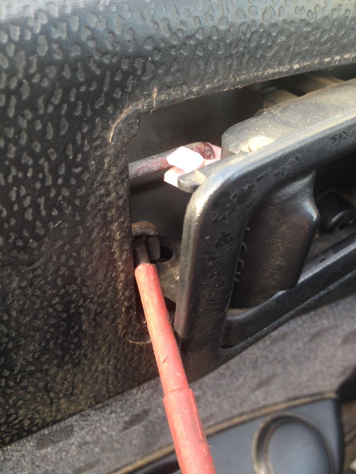 החוט האחרון הוא חוט החשמל של המנגנון, וזהו החוט האדום הארוך עם הפיוז עליו. את החוט הזה אנחנו אמורים להשחיל דרך הצינור המקשר שבדלת אל חיבור הפלוס שנמצא ליד קופסת הפיוזים, מעל הדוושות. לכן נצטרך להאריך את החוט הזה עם חוט רב גידי שקנינו מראש ולהשחיל אותו דרך צינור היציאה מהדלת. את כבל הפלוס שנמצא ליד קופסת הפיוזים ננתק, נחשוף מעט (אפשר בעדינות ובסבלנות עם סכין יפנית) ונחבר לחלק החשוף את החוט שהארכנו. כשנסיים נחבר אותו חזרה.
