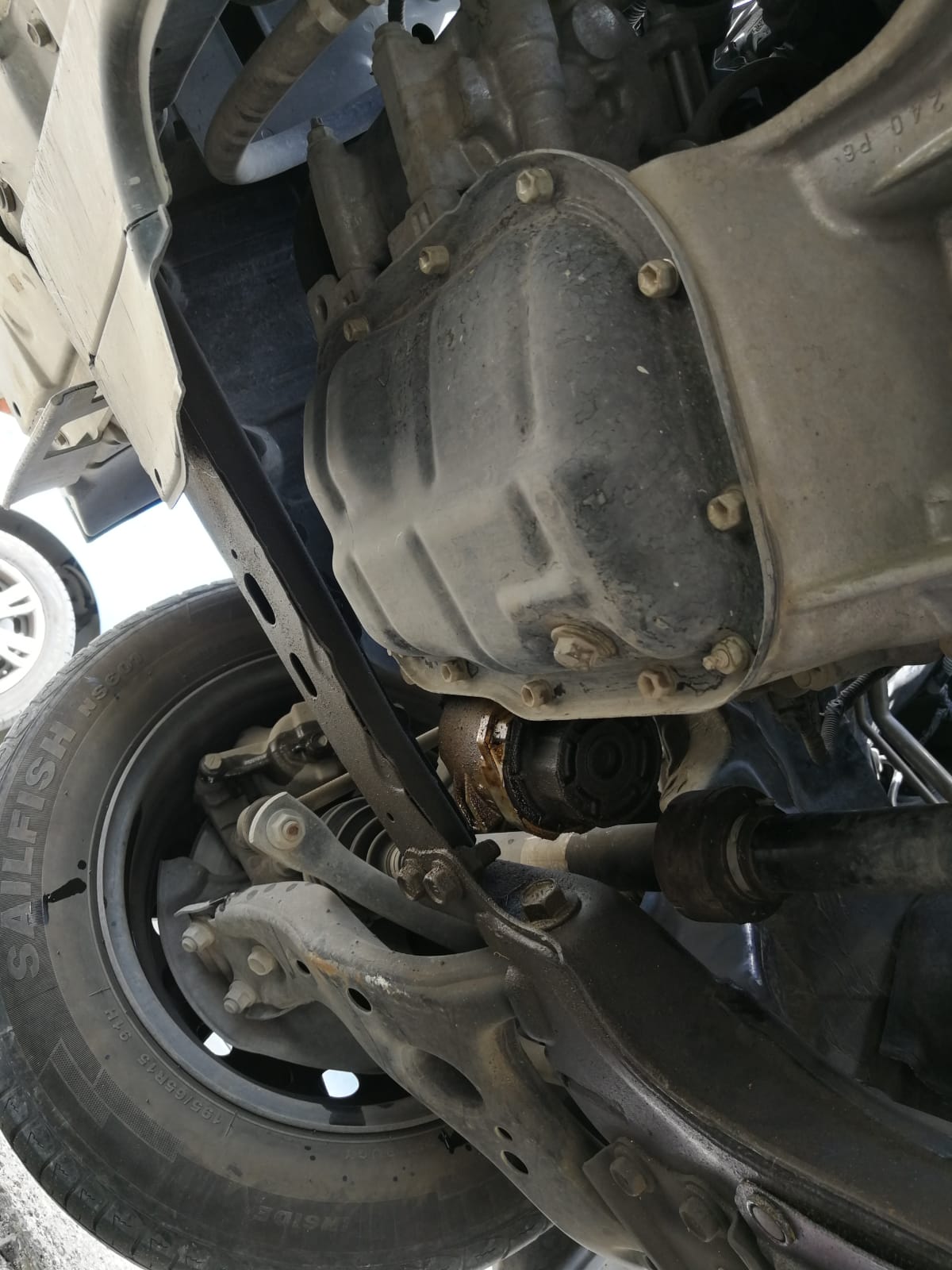 נרד מתחת לרכב עם ראצ'ט ובוקסה 14 מ״מ ונזהה את בורג הריקון.