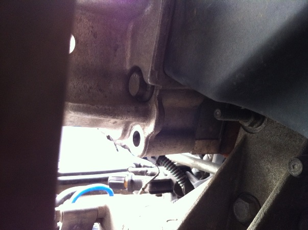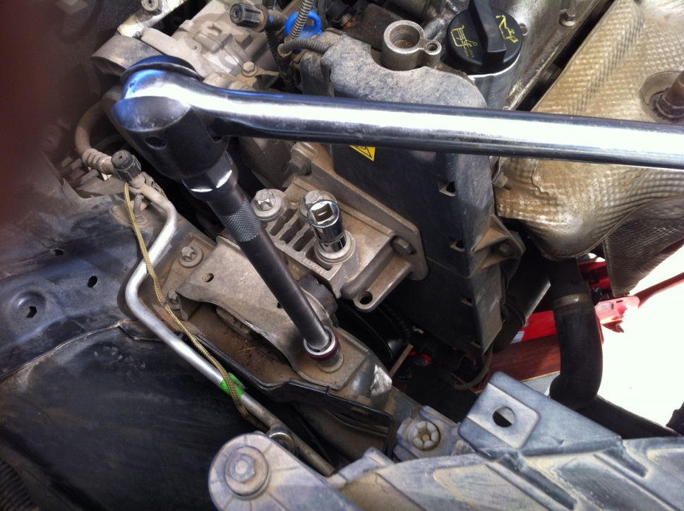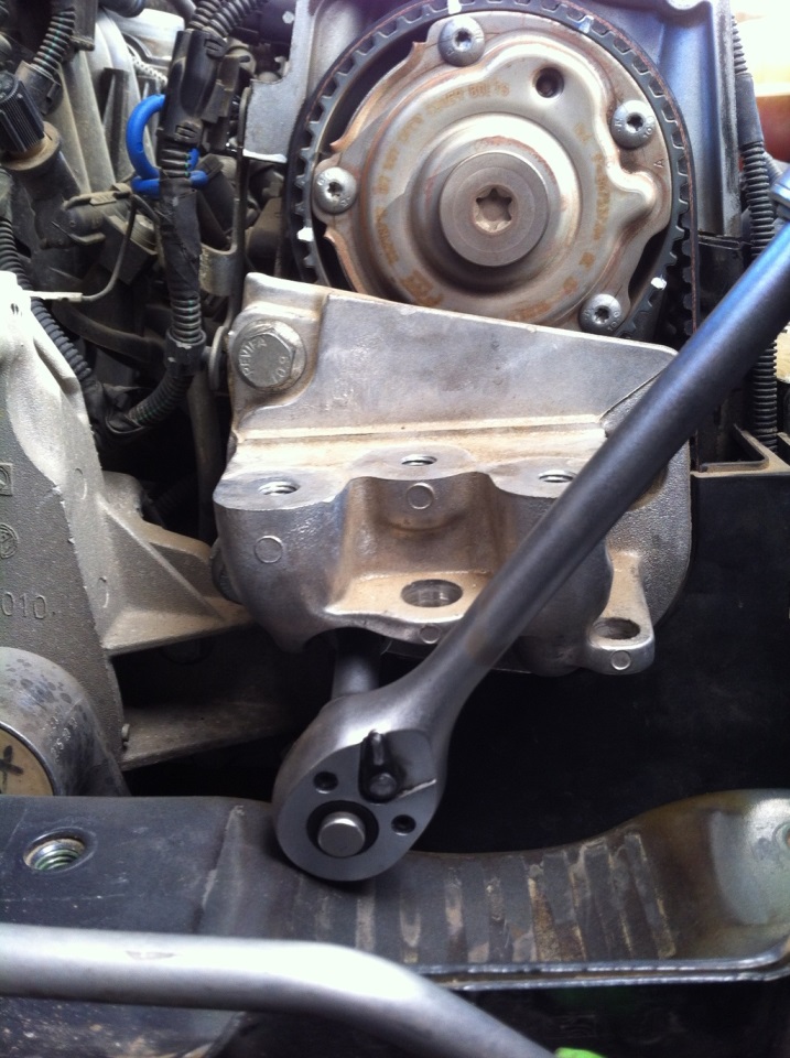 ממשיכים לפירוק בסיס תושבת המנוע. 4 ברגים 15 מ"מ שהתחתון מביניהם דורש הרמת המנוע מעט כדי לגשת אליו עם מאריך לראצ'ט.