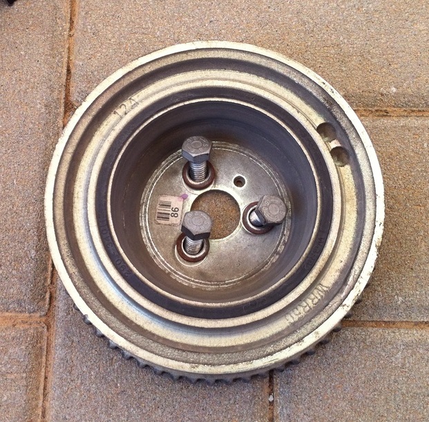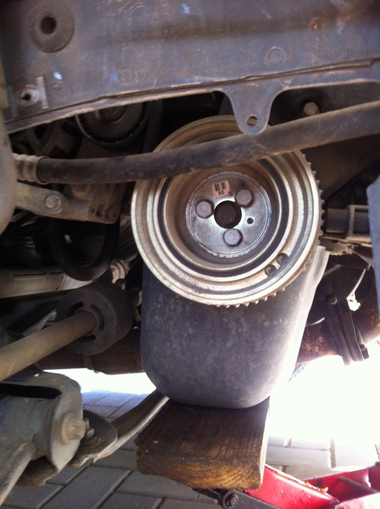 בעזרת אימפקט משחררים את שלושת הברגים של פולי הקראנק. (ניתן גם להיעזר באדם נוסף שיתן קונטרה מהבורג המרכזי [15 מ"מ] כדי שהמנוע לא יסתובב בפתיחה שלהם.)