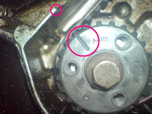 עכשיו אפשר לסובב את המנוע ידנית דרך הבורג המרכזי כדי לתאם את סימוני הטיימינג. בגלג"ש הקראנק יש חריץ שאמור להצביע על השפיץ בבלוק (גנבתי תמונה מגוגל) :