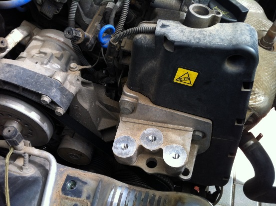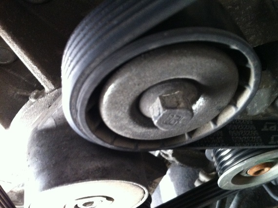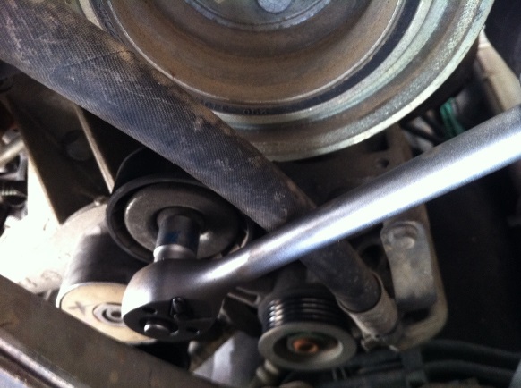 כעת ניתן לשלוף את רצועת האביזרים. בעזרת בוקסה 13 מ"מ מסיטים את המותחן עם כיוון השעון כדי לשחרר את המתיחה, ושולפים את הרצועה מהגלגלות.