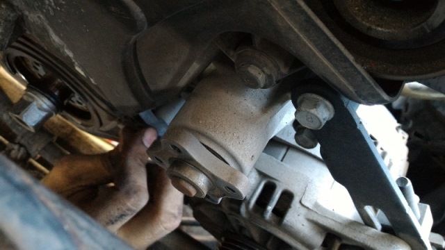 לבסוף רצועת ההגה – משחררים בורג 12 מ"מ דרך חור בפולי של המשאבה, ועוד בורג 12 מ"מ שמשמש כציר תזוזה למשאבה. מזיזים את המשאבה ומשחררים את הרצועה.