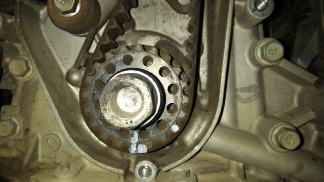 כעת ניתן לסובב את המנוע לסימוני הטיימינג. בעזרת בוקסה 22 מ"מ מסובבים ידנית עם כיוון השעון עד שהחור בגלג"ש הקאמשפט מתיישר עם הסימון האדום בראש המנוע (באקסנט הוא לא צבוע אדום, סתם חריץ) :