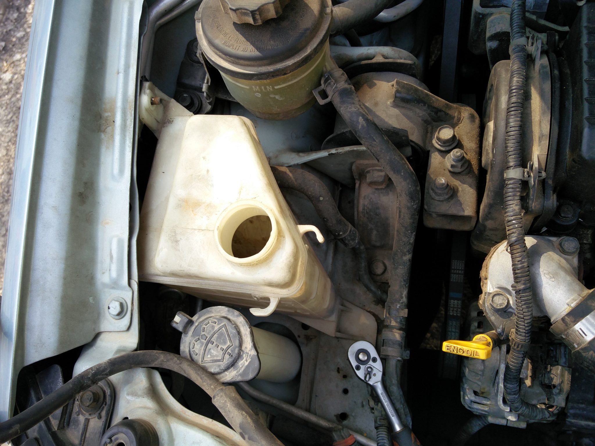 בינתים מפרקים את מיכל העודפים כדי להרביץ לו ניקוי טוב. אום אחד ובורג אחד והוא בחוץ. מנתקים גם את הצינור הדק שמגיע מהמיכל לרדיאטור.