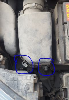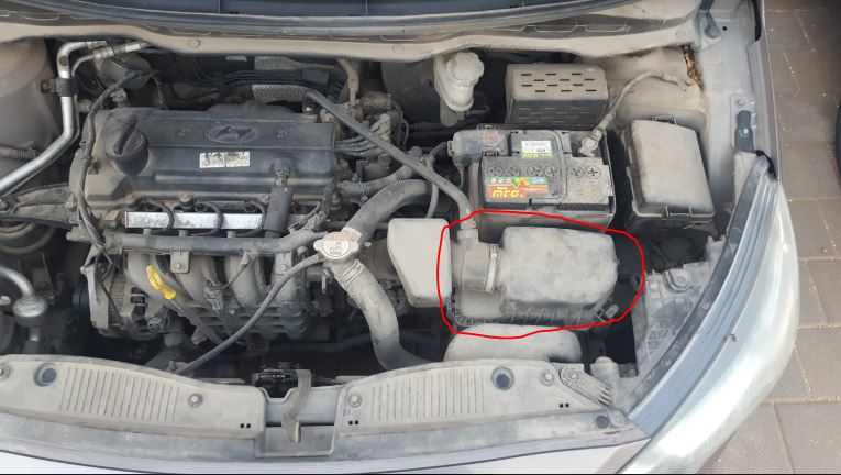 מאתרים את תא פילטר האוויר. כאשר אתם עומדים מול הרכב, הוא נמצא מצידו הימני של המנוע, מתחת למצבר (שייתכן שמכוסה בבית פלסטיק גם כן). הפילטר מסומן בתמונה בעיגול אדום.