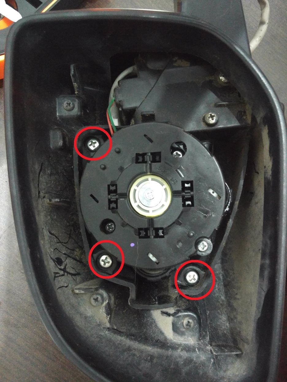 6. משחררים 3 ברגים שתופסים את מנגנון כיפול המראה, מסירים מכסה בתחתית המנגנון ומפרידים את מנגנון כיפול המראה ממנגנון כיוון המראה.