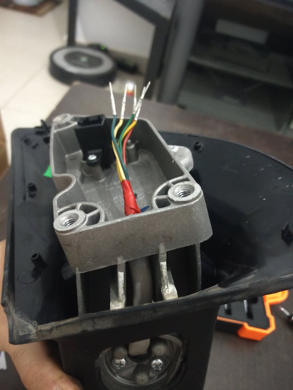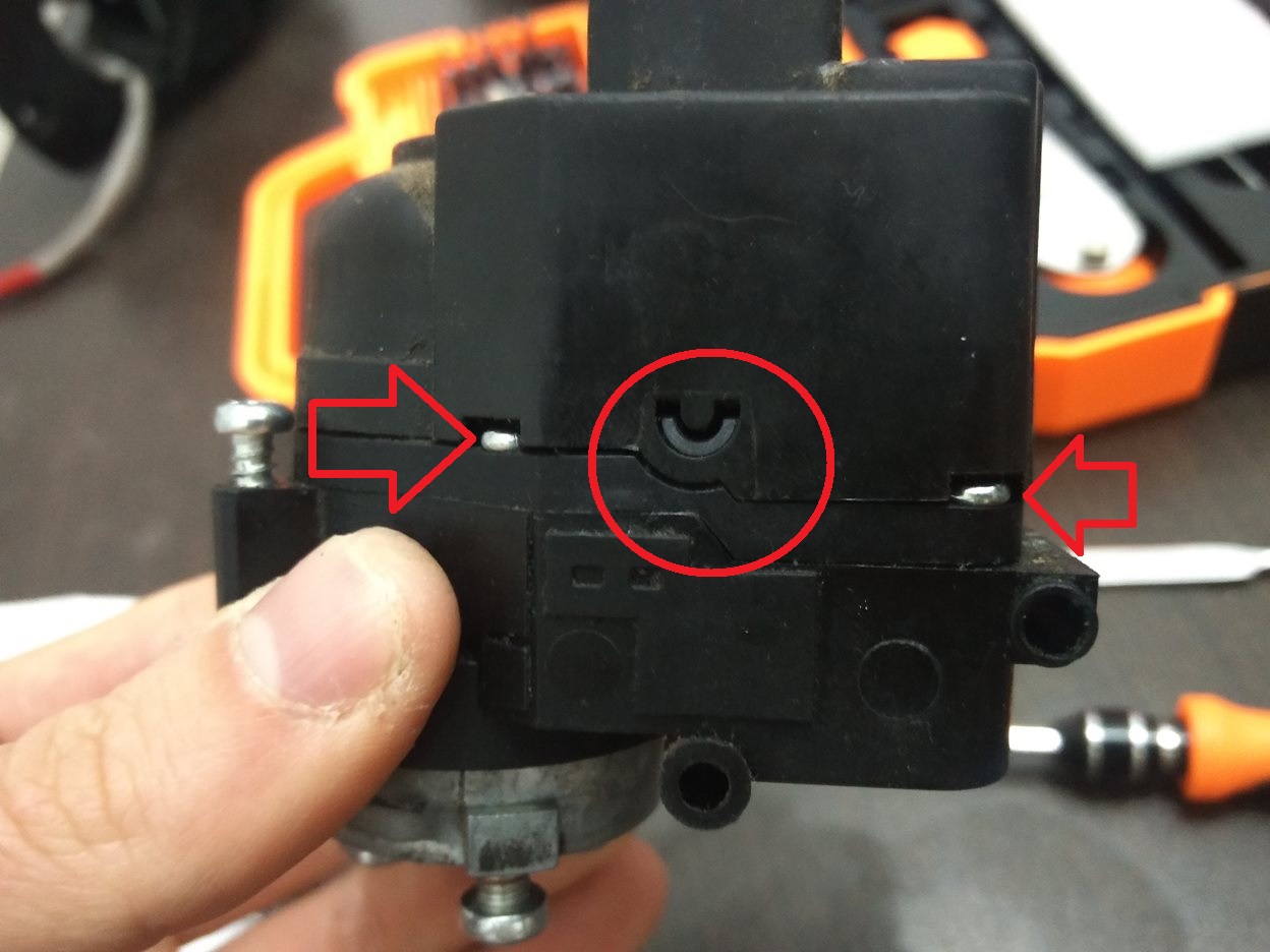 7. מושכים את לשוניות הפלסטיק (בעיגול אדום) משני הצדדים ומסירים את מכסה הפלסטיק. משחררים 4 ברגי פיליפס ומפרידים בין המנוע לגיר.