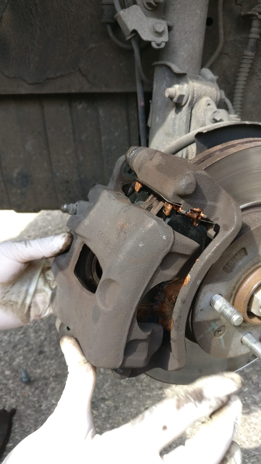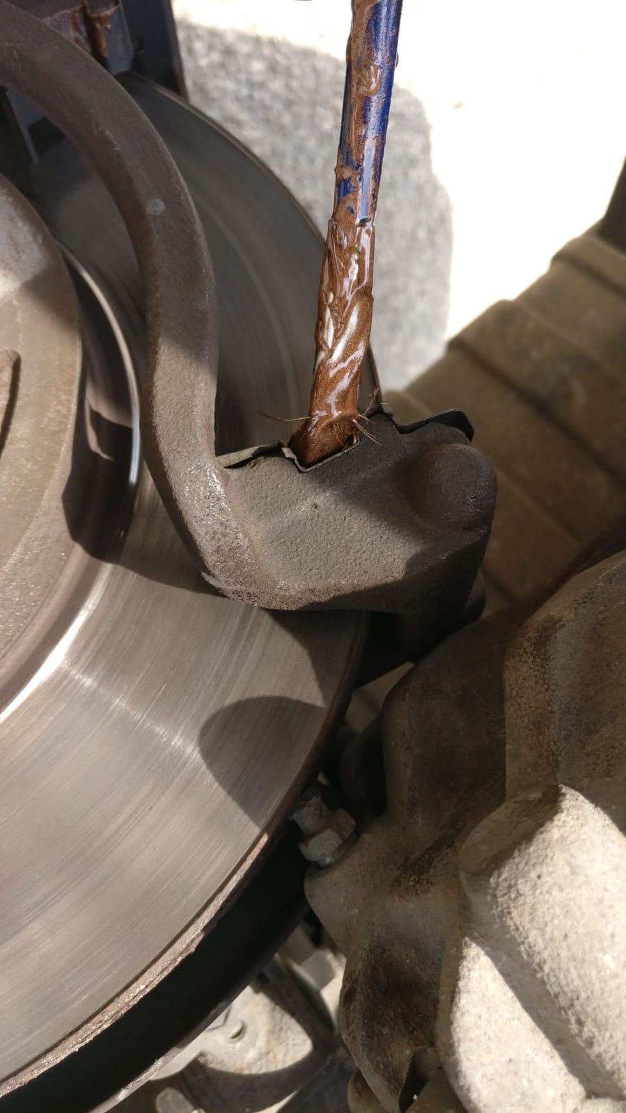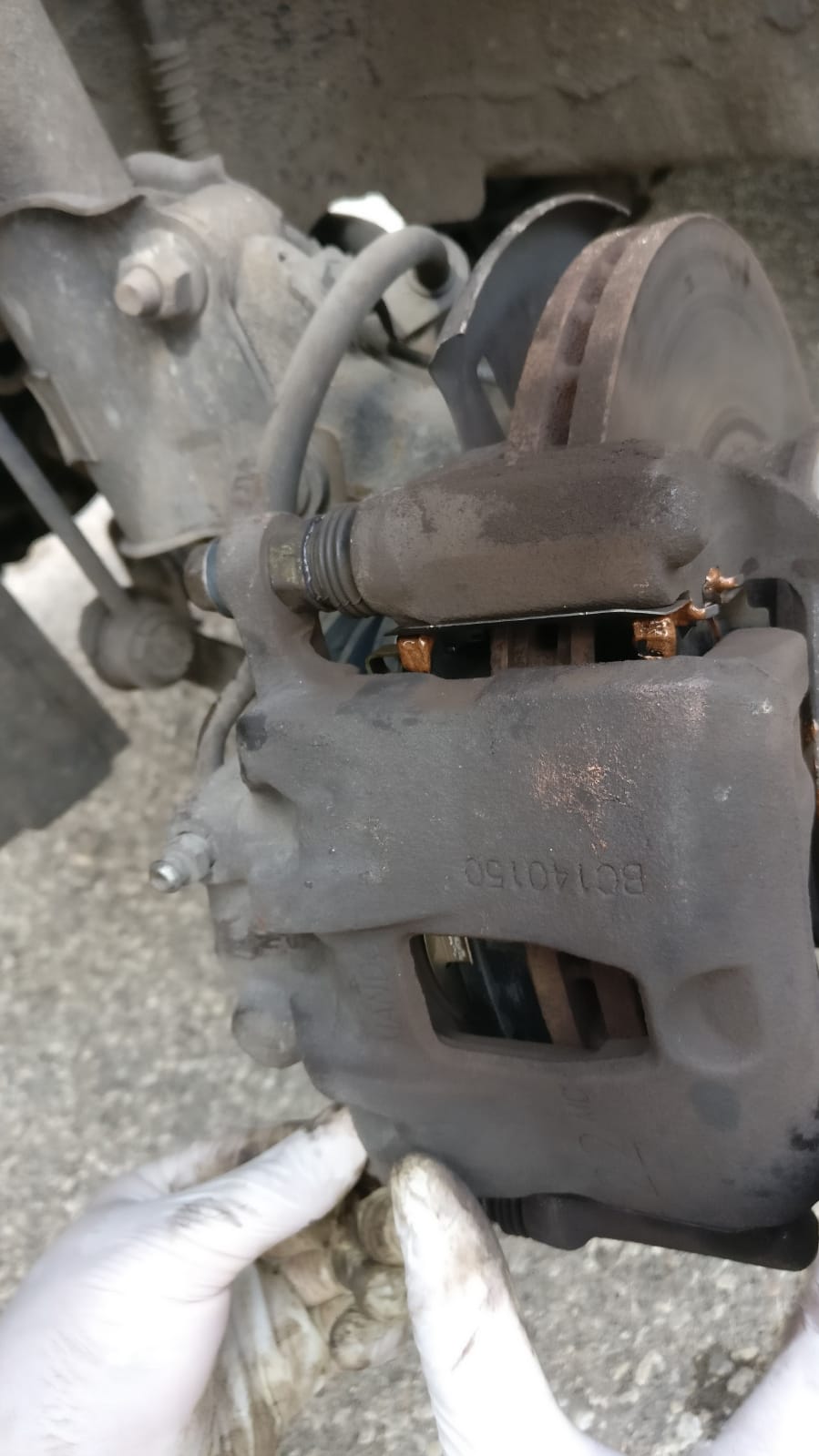ברגע ששחררתם את שני הברגים הללו יהיה ניתן לשחק עם הקליפר ולמשוך אותו החוצה. משכו אותו החוצה, פרקו ממנו את הרפידות הישנות. כעת נתלה את הקליפר על הבולם ונקשור אותו עם אזיקון על מנת שלא יופעל לחץ על צינור הבלם.