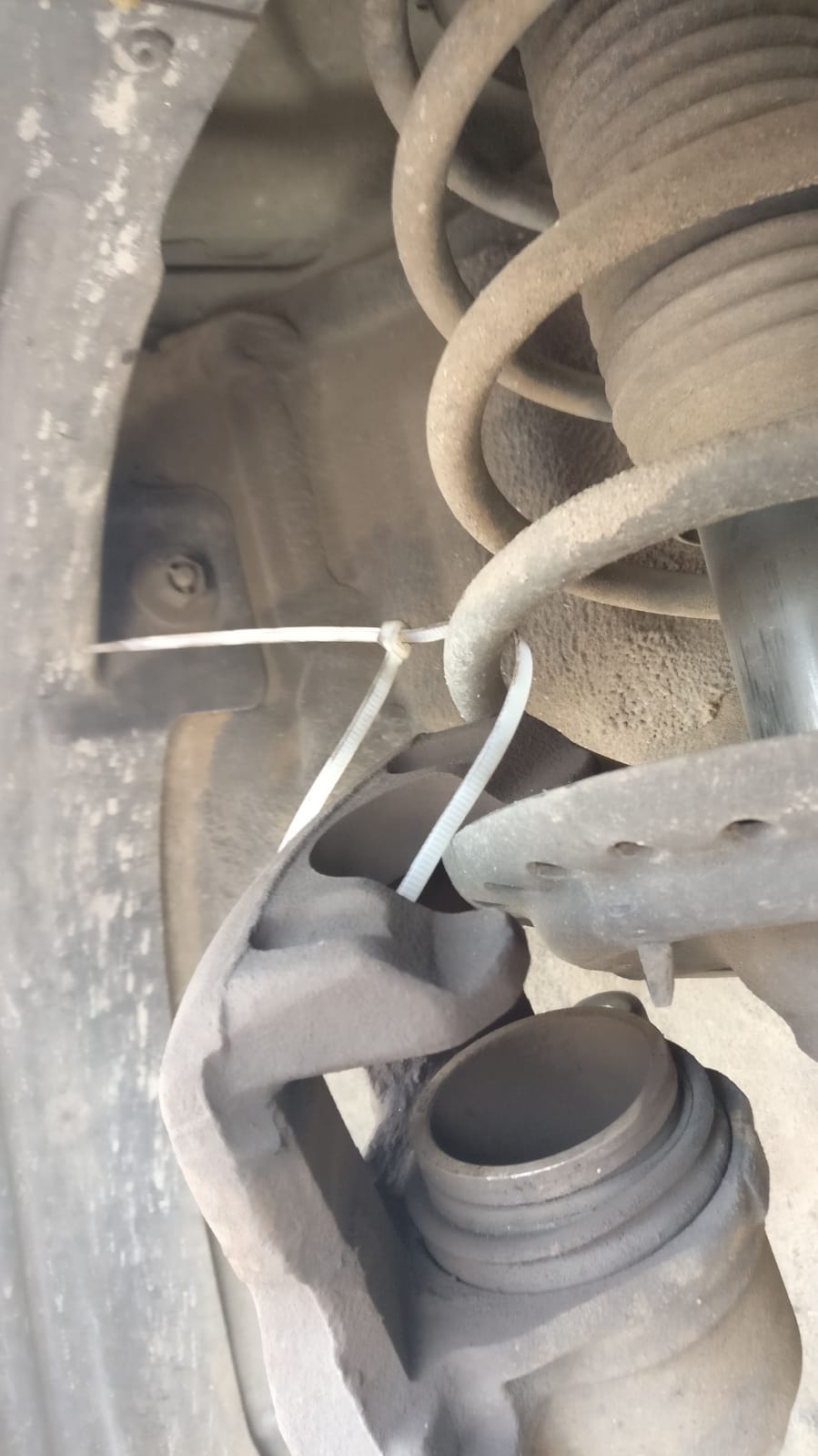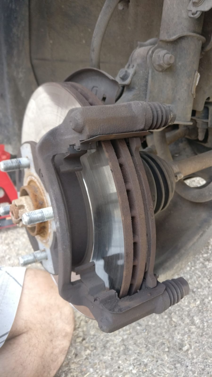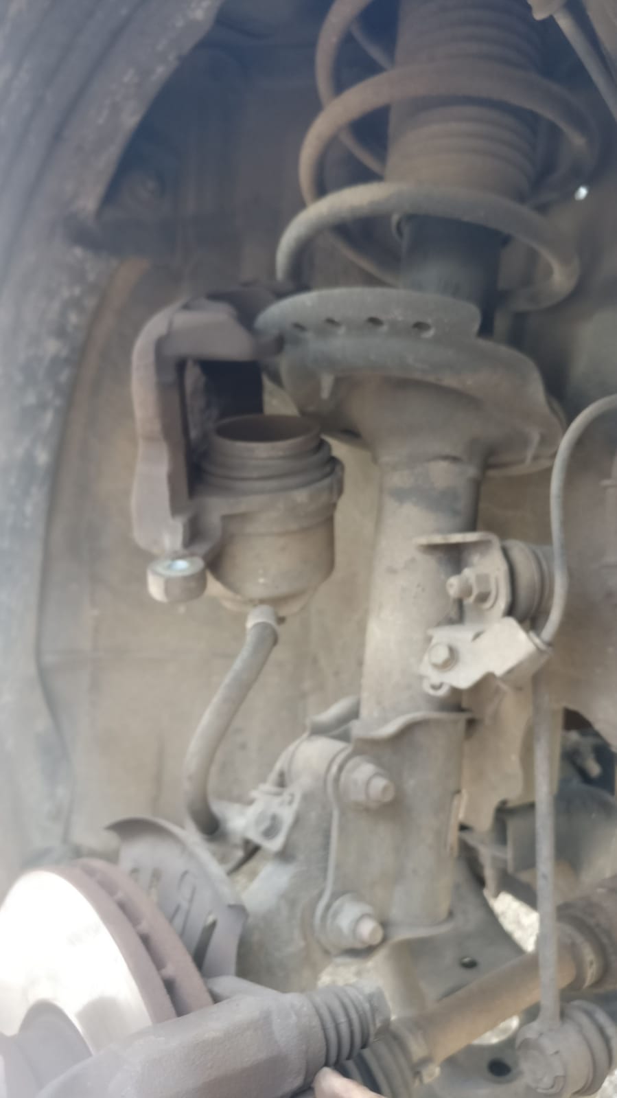 ברגע ששחררתם את שני הברגים הללו יהיה ניתן לשחק עם הקליפר ולמשוך אותו החוצה. משכו אותו החוצה, פרקו ממנו את הרפידות הישנות. כעת נתלה את הקליפר על הבולם ונקשור אותו עם אזיקון על מנת שלא יופעל לחץ על צינור הבלם.