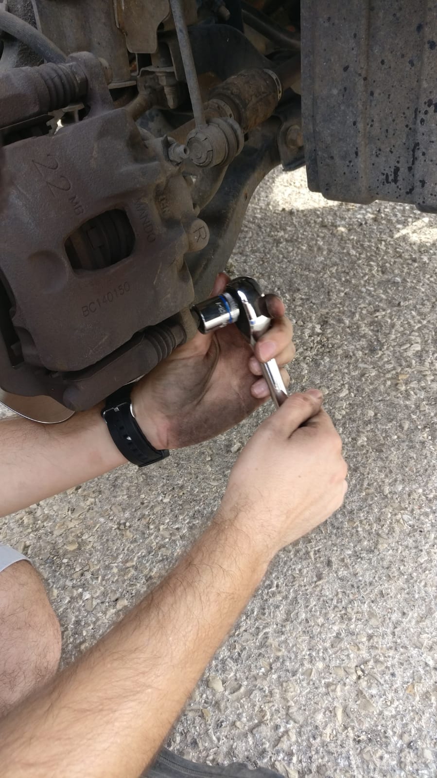 נפתח את הברגים של מובילי הקליפר בעזרת בוקסה 14 מ״מ, שימו לב שיכול להיות שתצטרכו מפתח פתוח על מנת לתת קונטרה בעזרת המוביל עצמו כי אולי הוא יסתובב על ריק בשלב מסויים.