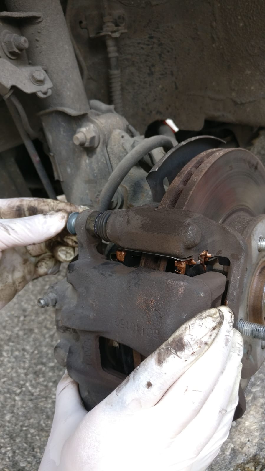 נמשוך את מובילי הקליפר מהגומיה שלהם כך שהגומיה תישאר מחוברת, תהיו עדינים על מנת לא לקרוע אותה. לפעמים הגומיה מעט נדבקת למוביל, ניתן לשחרר על ידי החזקה בעדינות עם יד אחת וסיבוב של המוביל על היד השניה בעדינות עד שהם נפרדים. לאחר מכן ננקה את המובילים טוב טוב, נמרח עליהם גריז קרמי סגול ונחזיר אותם בחזרה. כמו כן זכרו איזה מהמובילים עליון ואיזה תחתון, הם שונים. באחד קיים גומי בקצה ובשני לא. ככל הנראה זה עם הגומי יהיה התחתון.