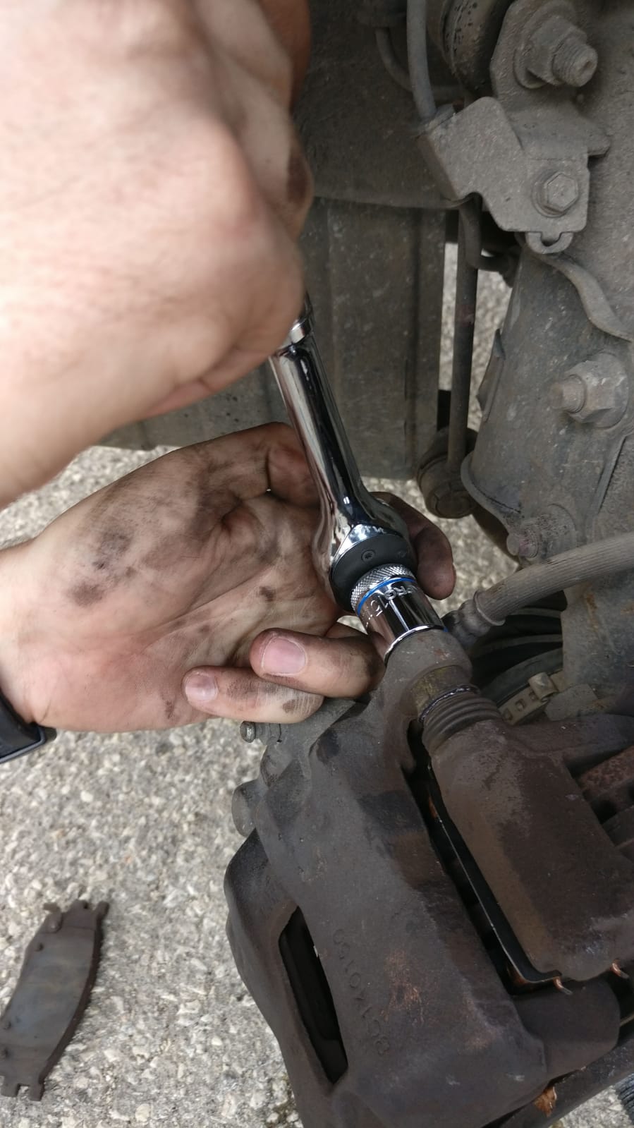 כעת ניתן להלביש את הקליפר עצמו בחזרה על התושבת ועל הרפידות. נבריג את הברגים הראשונים שפירקנו שמחזיקים את הקליפר למובילים. שימו לב להתחיל בהברגה ידינית, לראות שהכל נכנס ישר וההברגה לא נפגמת ולאחר מכן לסגור בעזרת ראצ'ט. שימו לב לא לסגור חזק מידי, מדובר בהברגה עדינה יחסית והיא תיאכל.