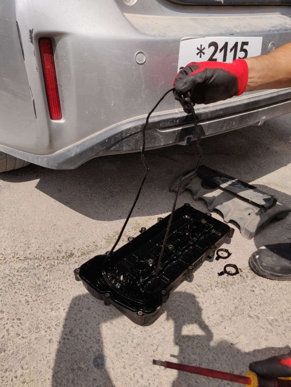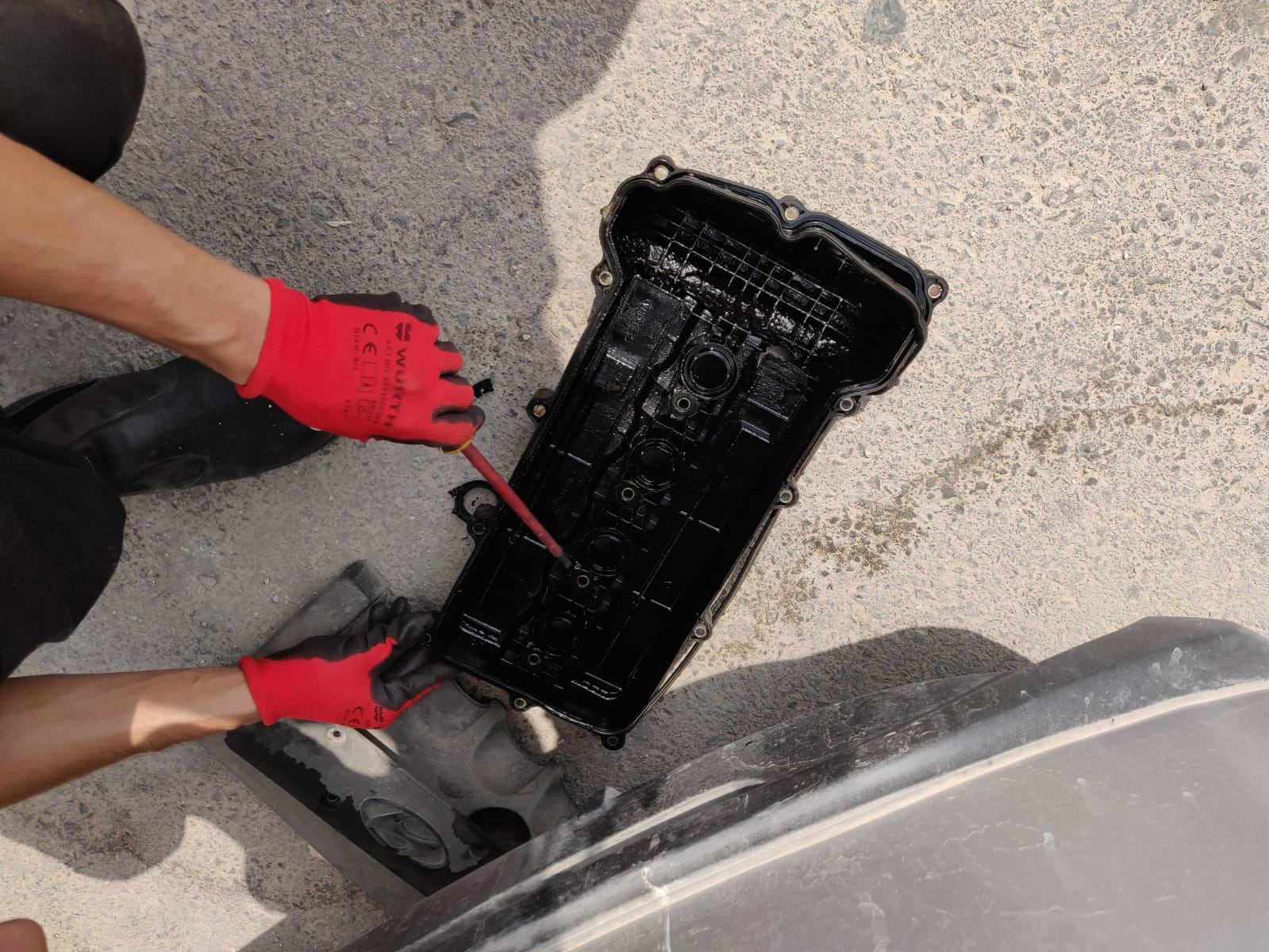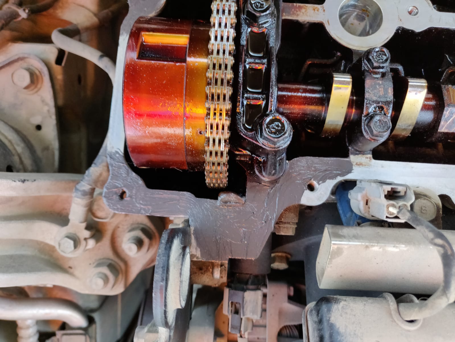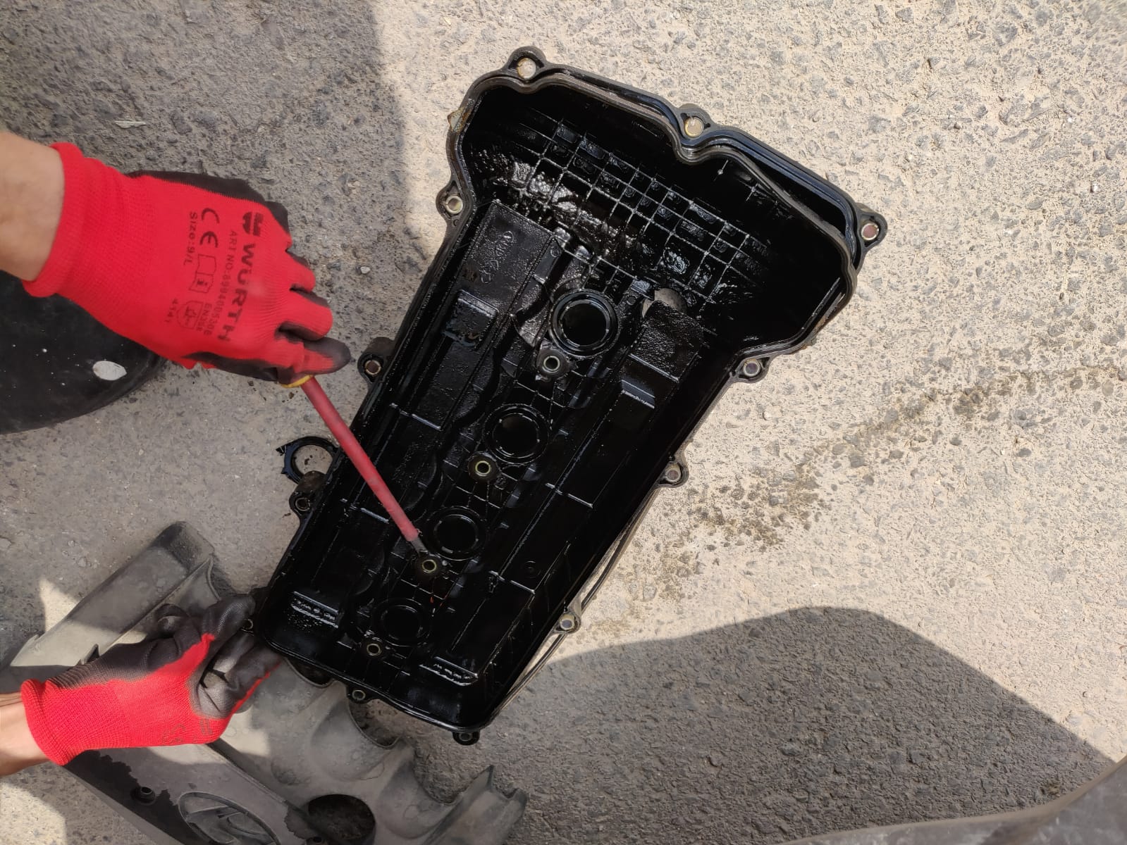 – כעת נחזור אל המנוע עצמו, ננקה בעזרת ה- scraper את כל המשטח שבו ישב האטם החדש, ננסה להחליק את המשטח הזה כמה שיותר ולהעיף שמן שרוף ושאריות אטם