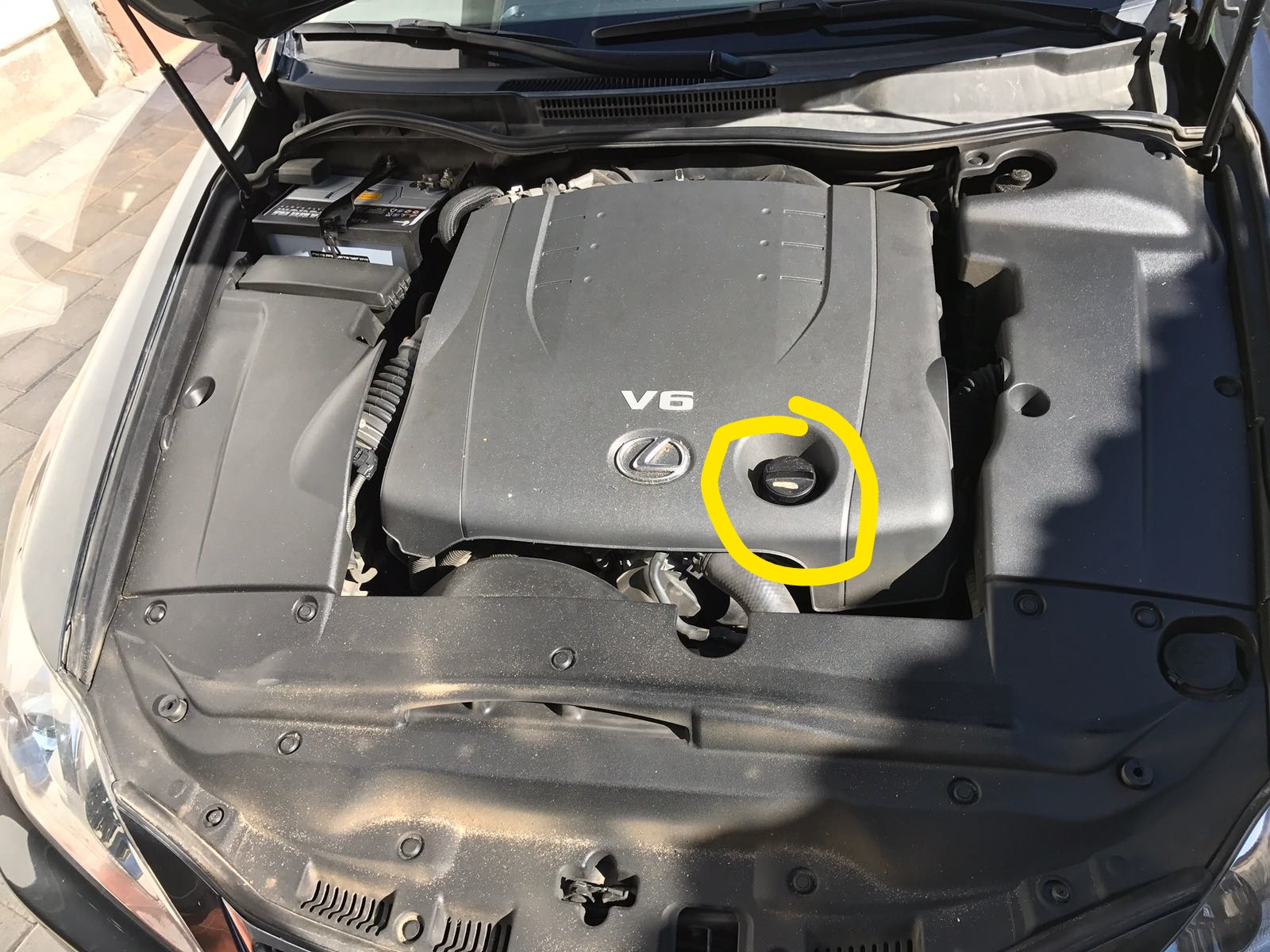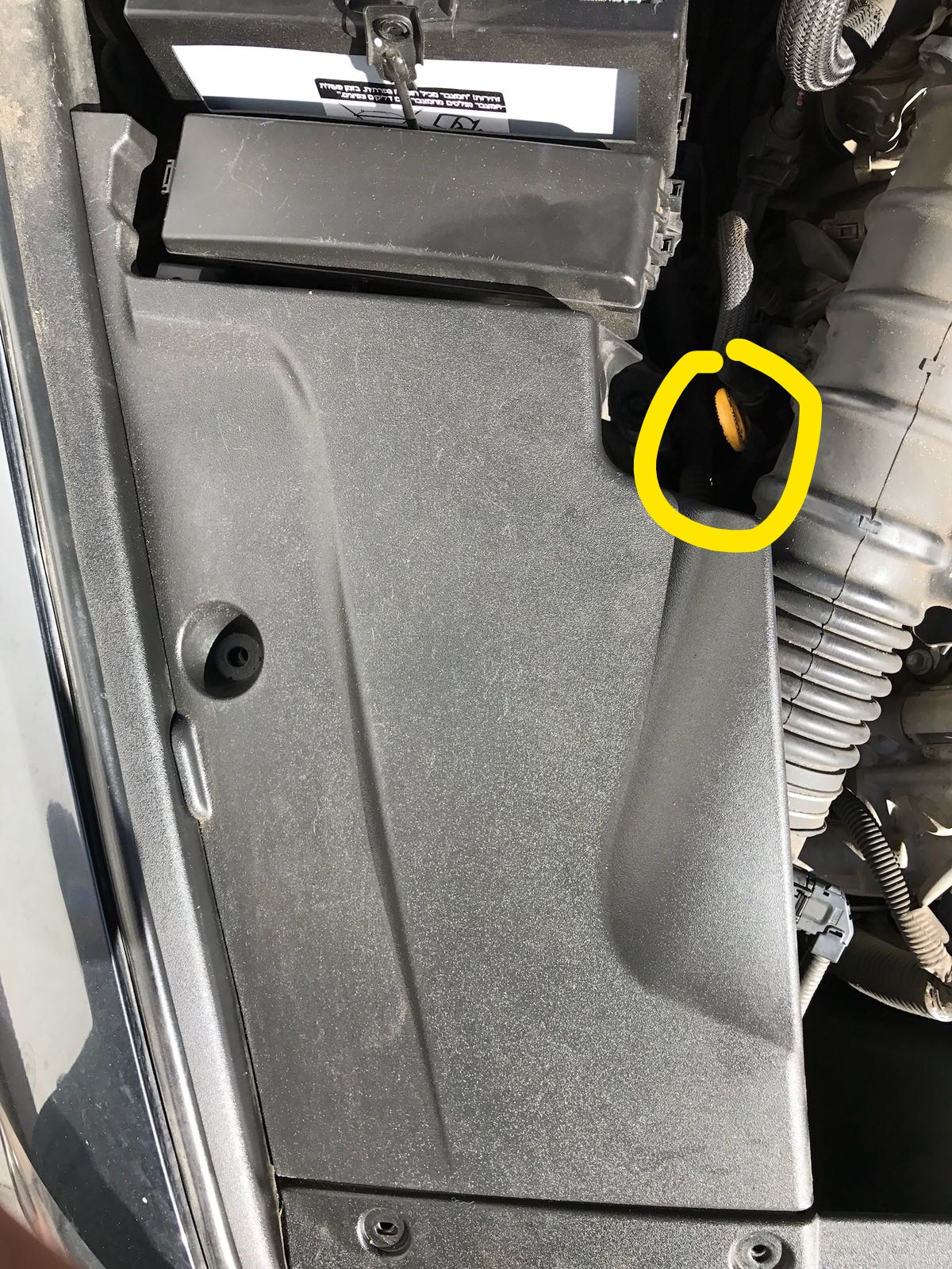 2. פתיחת פקק מילוי שמן מנוע (מסומן בצהוב) והוצאת מדיד שמן מנוע (נמצא בצד שמאל בין המנוע למצבר).